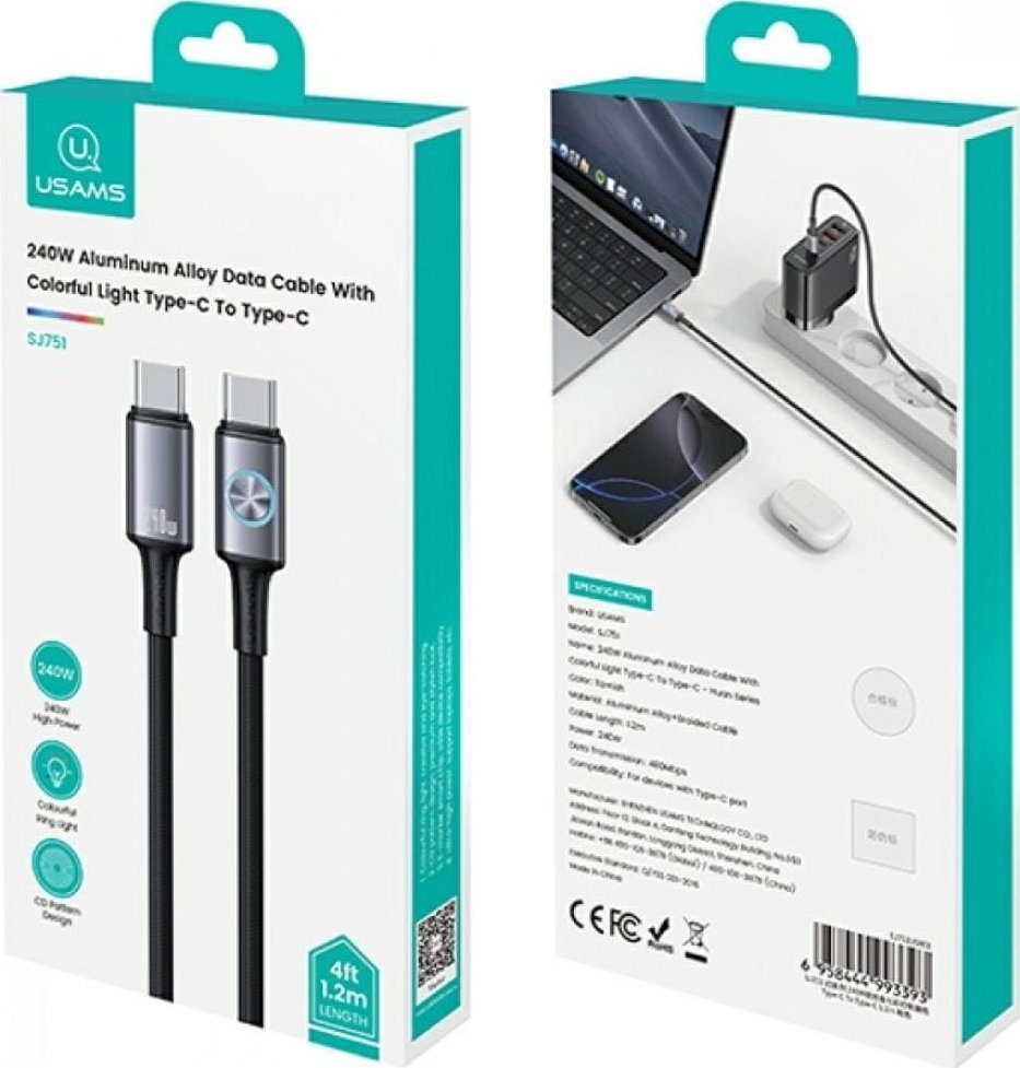 USAMS SJ751 to przewód USB-C ↔ USB-C stworzony do szybkiego i bezpiecznego ładowania urządzeń – od smartfonów i tabletów po laptopy – z mocą do 240 W (PD). W praktyce oznacza to stabilne zasilanie nawet wymagających sprzętów, pod warunkiem użycia kompatybilnej ładowarki i urządzenia.