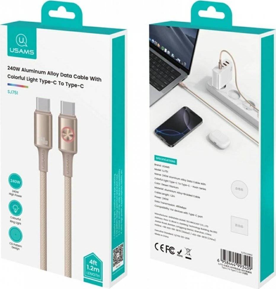 Καλώδιο USAMS Huan Series SJ751 240W USB-C σε USB-C 1,2 m τιτανίου