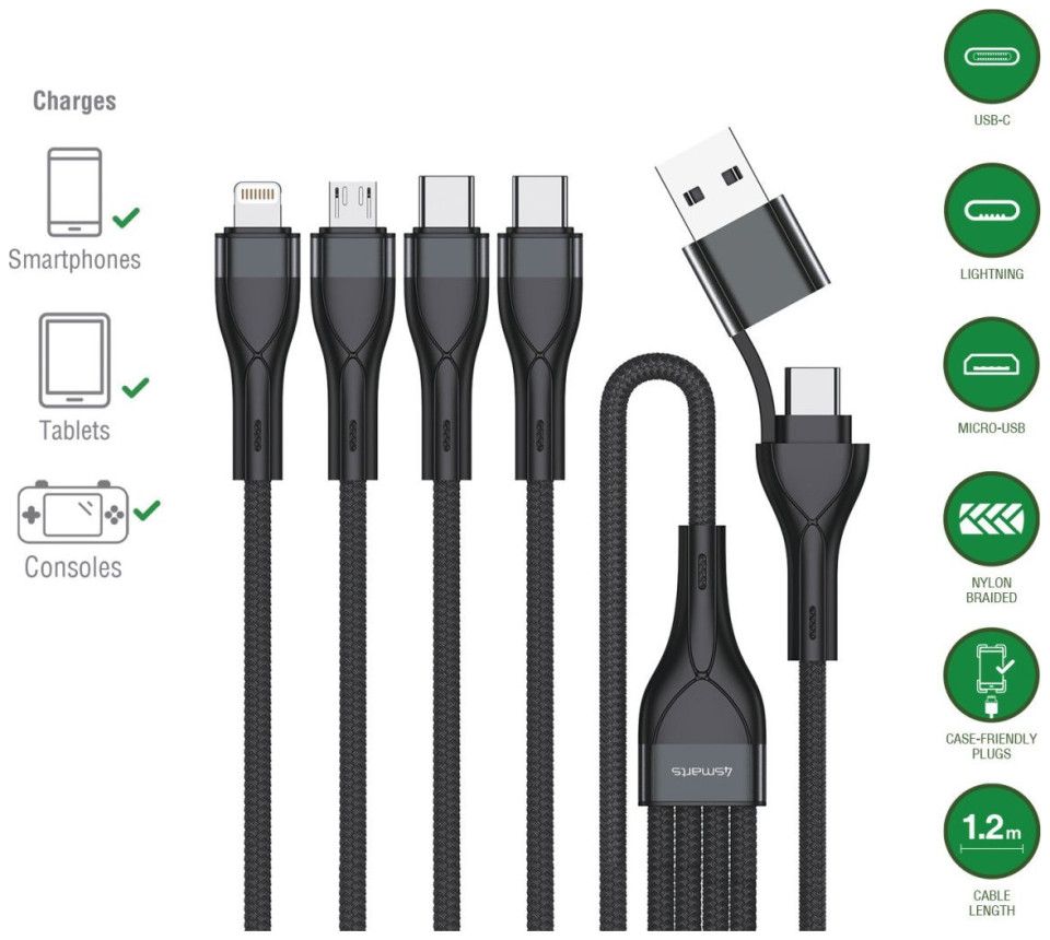 {Plugin Type} Απλή προσθήκη . {Μήκος καλωδίου} 1,2 m . {Χρώμα} Μαύρο. {Τύπος καλωδίου} Αρσενικό - Αρσενικό . {Standard} Δεν υπάρχουν δεδομένα . {Πλεξούδα} Χωρίς πλέξη. {Σύνδεση 1} USB-A + USB-C . {Connector 2} 2x USB-C + Lightning + microUSB