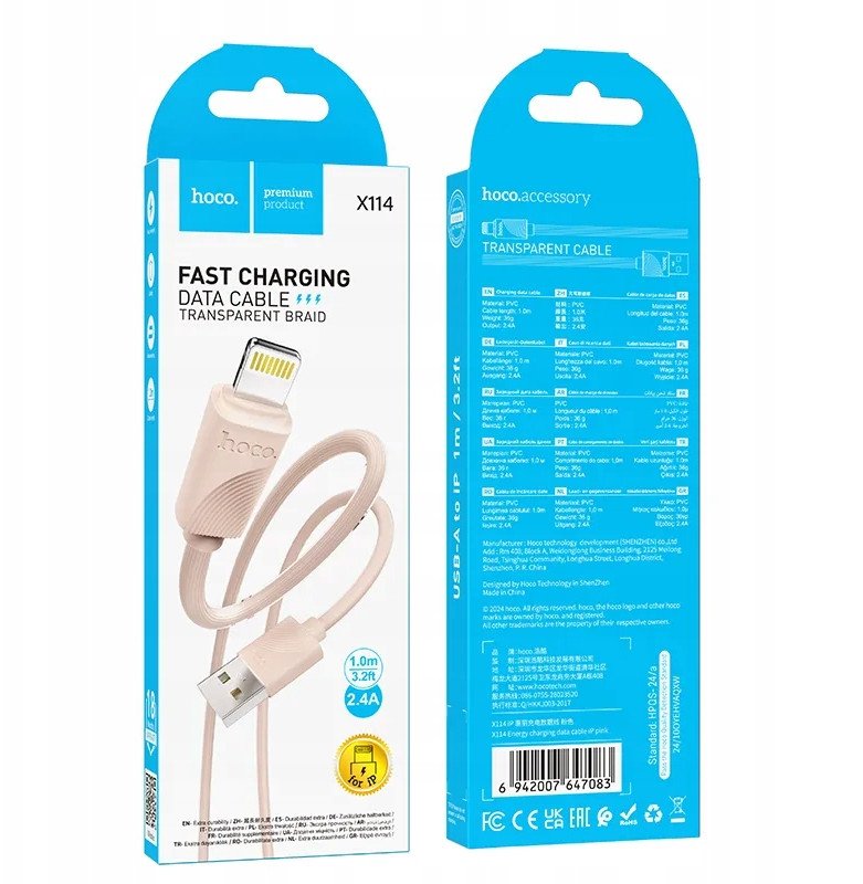 Καλώδιο USB A σε Lightning Hoco 2,4A 1 m X114 ροζ