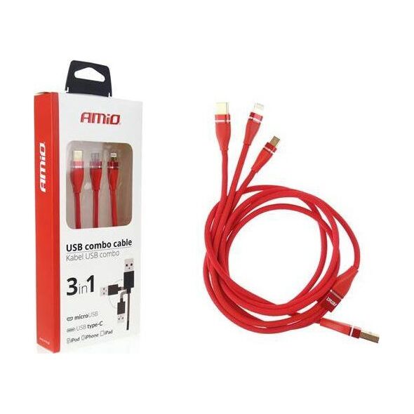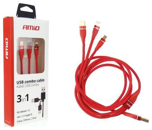 Kabel USB w tekstylnym oplocie posiadający posiadający 3 różne zakończenia: Lightning (iPhone, iPad), USB typu C oraz microUSB Długość kabla: 120cm Maksymalny prąd ładowania: 3.1A Możliwość ładowania kilku urządzeń jednocześnie