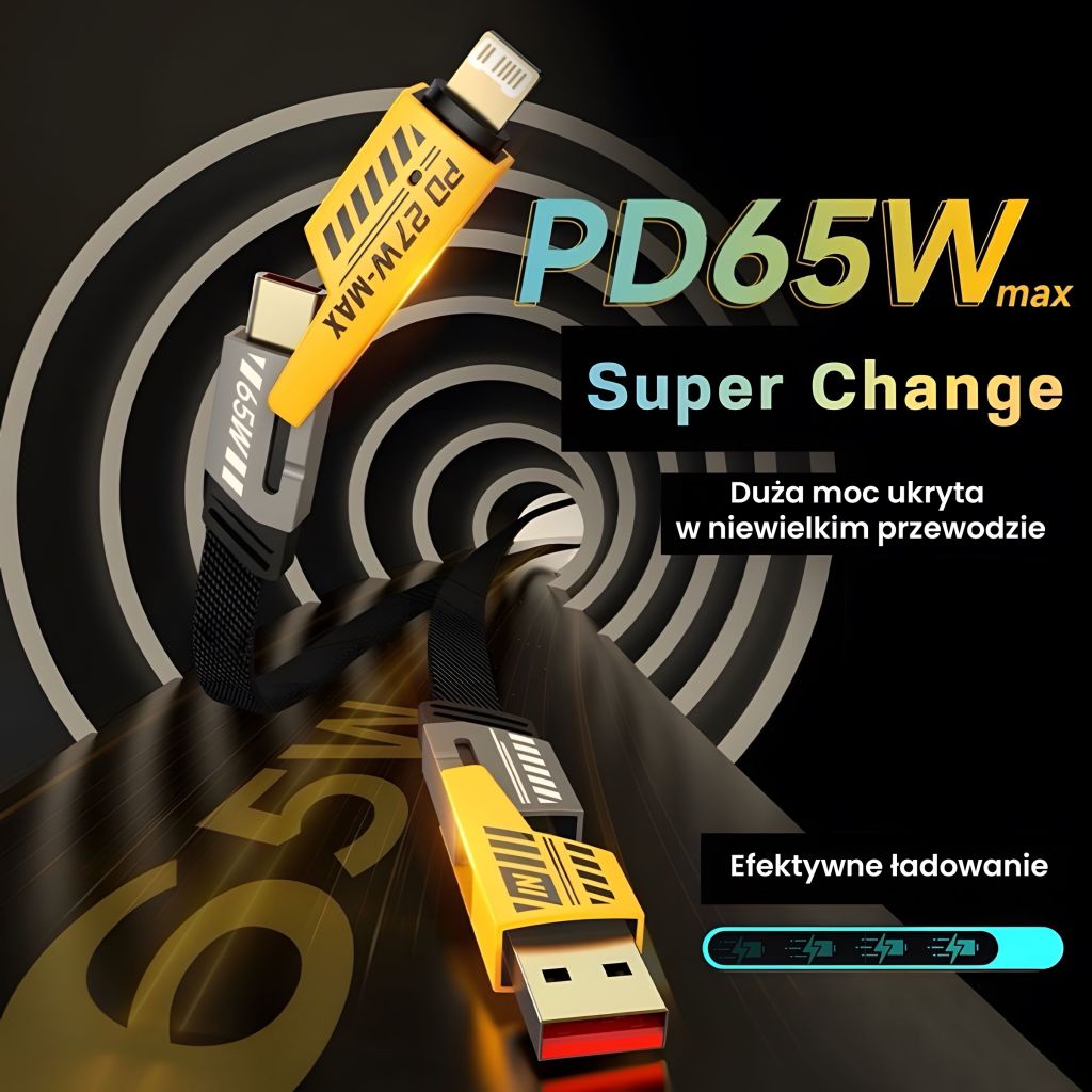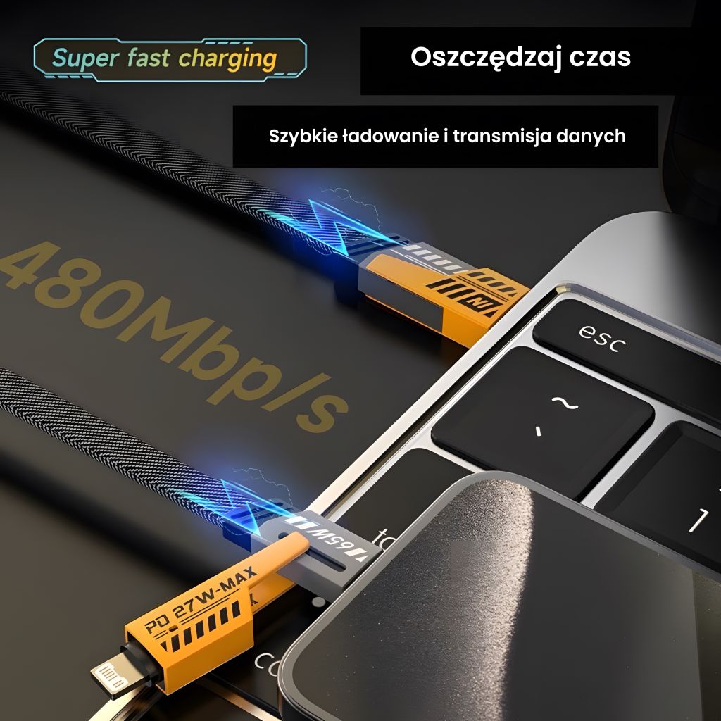 Doświadcz superszybkiego ładowania Twojego urządzenia! Korzystając z interfejsów USB-C możesz poczuć pełną moc przewodu - aż 65W! Dodatkowo, wykorzystując końcówki USB-C/Lightning możesz ładować swojego iPhone'a z mocą maksymalną do 27W. Wykorzystanie technologii Fast Charge oraz Power Delivery sprawia, że można w pełni wykorzystywać pełny potencjał przewodu.