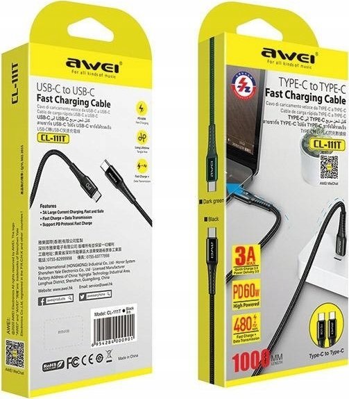 Καλώδιο USB Awei USB-C - USB-C 1 m Μαύρο (CL-111T)