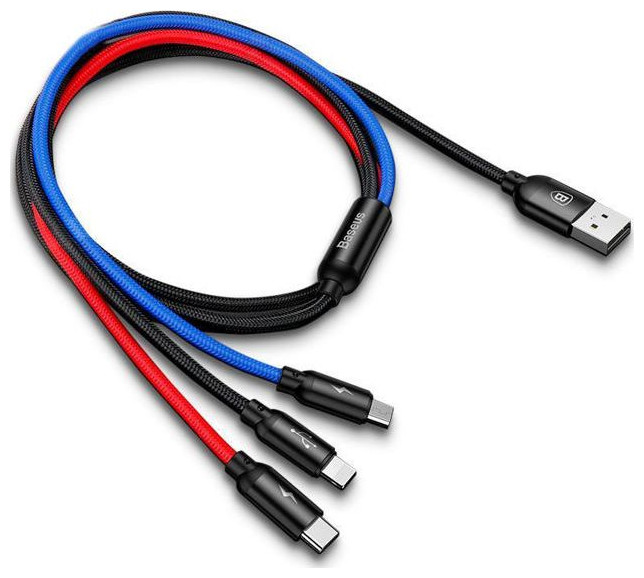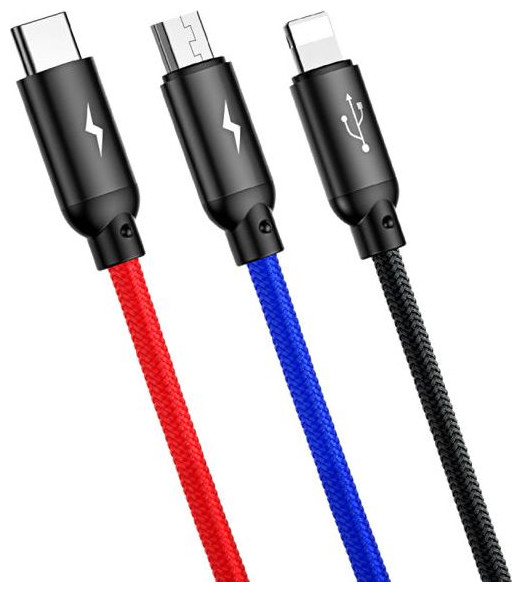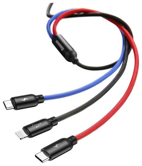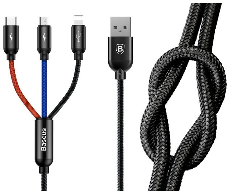 Το καλώδιο Baseus σάς επιτρέπει να συγχρονίζετε, να φορτίζετε και να μεταφέρετε αρχεία μεταξύ συσκευών που διαθέτουν είσοδο USB και συσκευών που είναι εξοπλισμένες με την τελευταία υποδοχή USB Type C, USB-C, υποδοχή micro USB και lightning 8pin για Apple iPhone, iPad, iPod. Κάθε βύσμα έχει διαφορετικό χρώμα πλεξούδας (μπλε, κόκκινο, μαύρο). Το προϊόν συσκευάζεται στο αρχικό κουτί του κατασκευαστή.