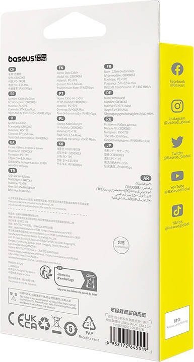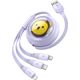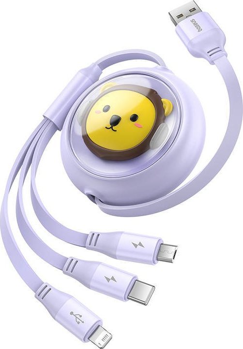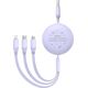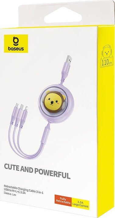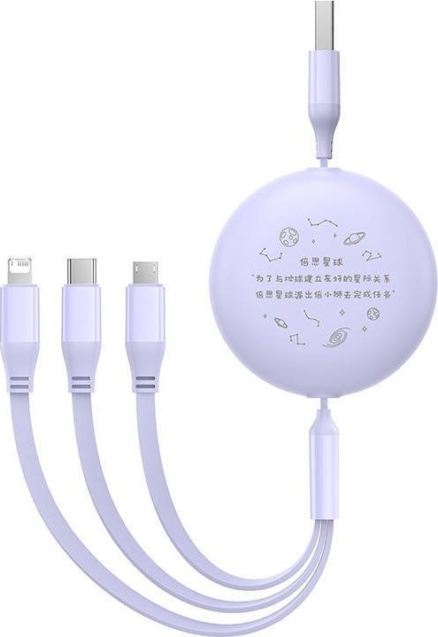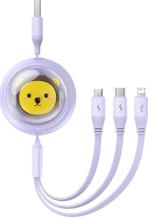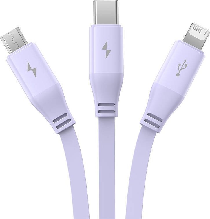 Kabel ładowania 3w1 Baseus USB do USB-C, USB-M, Lightning 3,5A, 1,1m (fioletowy) 6932172645519 054737 Kabel ładowania 3w1 Baseus USB do USB-C, USB-M, Lightning 3,5A, 1,1m (fioletowy) Ładuj urządzenie i przesyłaj dane. Kabel oferuje 3 porty wyjściowe, dzięki czemu możesz do niego podłączyć kilka urządzeń jednocześnie. Co więcej, umożliwia transfer danych z prędkością 480 Mbps. Z kolei zwijana konstrukcja ułatwia przechowywanie, a solidny design zapewnia wytrzymałość i odporność na zużycie. Ładowanie i transfer danych Za pomocą kabla Baseus możesz ładować urządzenia o natężeniu 3.5A. Produkt oferuje porty micro USB, Lightning, USB-C, dzięki czemu podłączysz do niego 3 smartfony jednocześnie. Ponadto kabel umożliwia przesyłanie danych z prędkością 480 Mbps. Teraz w krótkim czasie skopiujesz zdjęcia czy filmy. Wytrzymała konstrukcja Kolejną zaletą kabla jest jego zwijana, wytrzymała konstrukcja. Możesz rozwinąć kabel do maksymalnie 1.1 m i używać tak, jak Ci wygodnie. Co więcej, produkt wykończono tworzywem TPE, co zapewnia odporność na ciągnięcie, przegrzanie i zginanie. Ponadto, zastosowanie miedzi zapewnia dobre przewodnictwo i pozwala na szybsze ładowanie. Producent Baseus Kod producenta P10362900511-00 Kolor fioletowy Materiał PC, TPE Długość 1,1 m Waga ok. 75 g Natężenie 5V/3.5A max. Prędkość transmisji 480 Mbps Porty wyjściowe micro USB, Lightning, USB-C