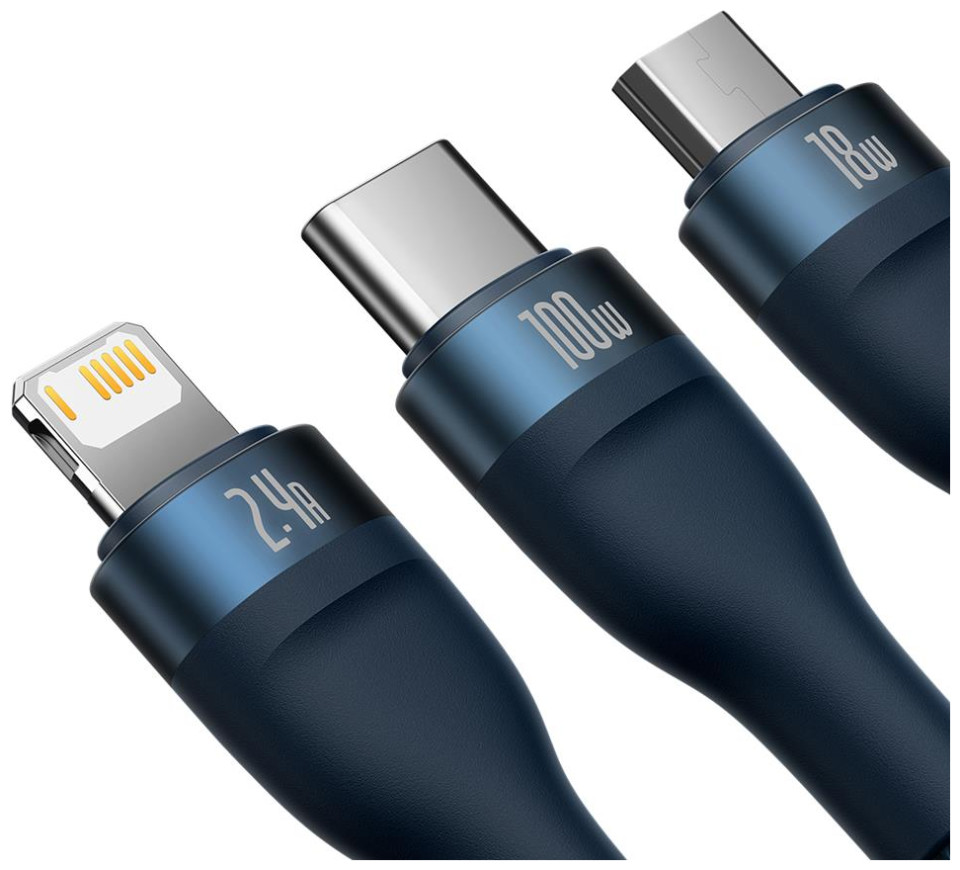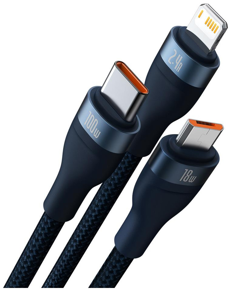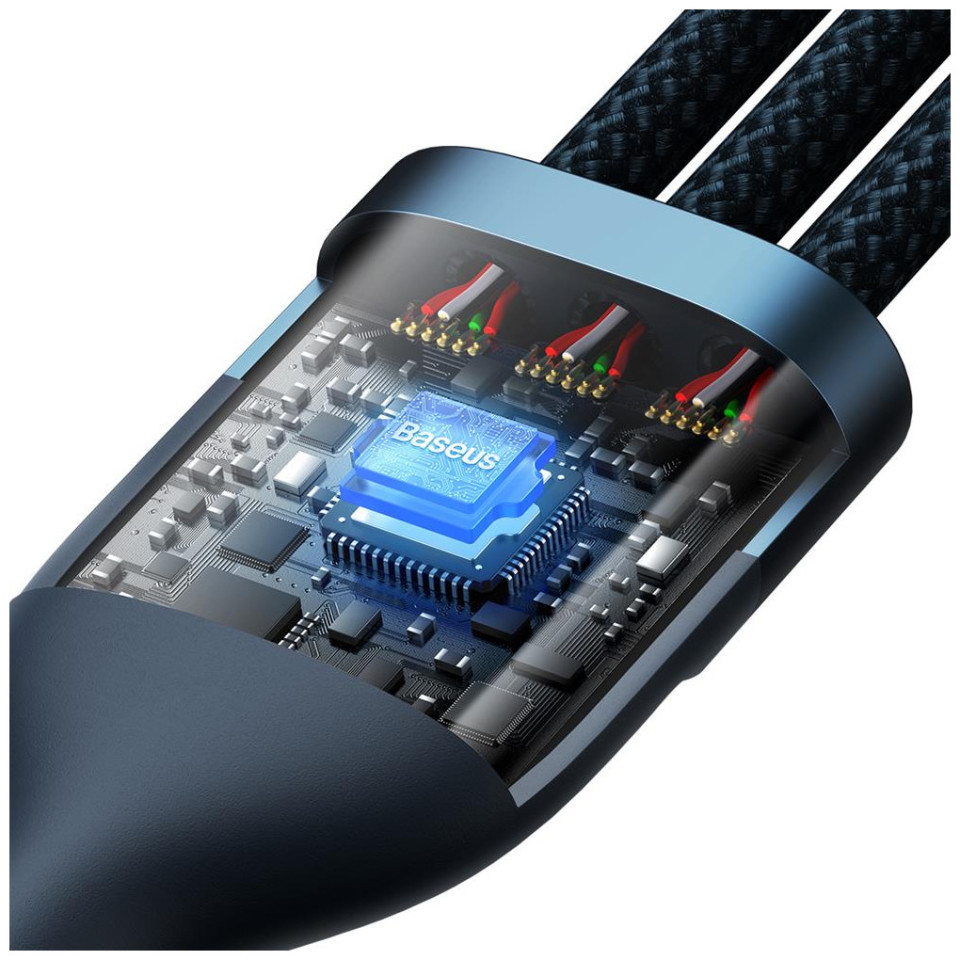 Baseus Flash Series Ⅱ kabel 3w1 do szybkiego ładowania USB-A do USB-C / Micro-USB / Lightning 66W 480Mb/s 1.2m niebieskiWielofunkcyjny kabel do ładowania USB-A na USB-C, Micro-USB oraz Lightning powinien znajdować się u każdego użytkownika sprzętu elektronicznego. Produkt doskonale sprawdza się do zasilania popularnych urządzeń elektronicznych np. telefonów, słuchawek, lampek, małych sprzętów elektronicznych. Kabel przeznaczony jest do pracy pod maksymalnym obciążeniem 66W. Dzięki wbudowanym zabezpieczeniom jego konstrukcja nie ulega uszkodzeniom, czy przegrzaniu, co przekłada się na efektywność jego działania.Specyfikacja:Marka: Baseus