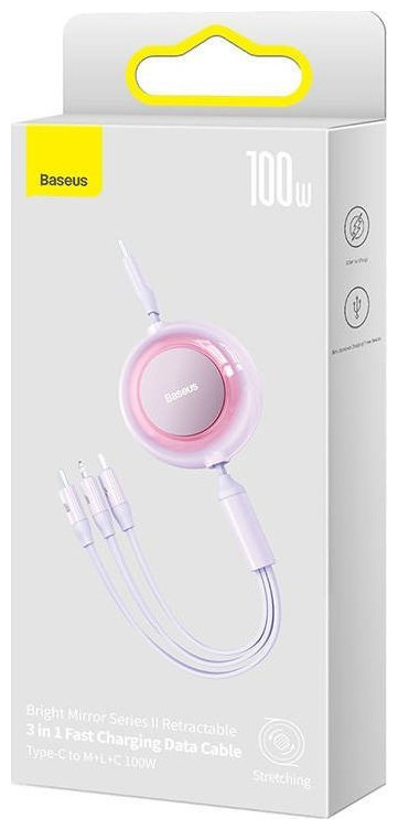 Kabel USB-C 3w1 Baseus Bright Mirror 4 Z kablem USB-C 3w1 Baseus Bright Mirror 4 zyskasz dostęp do szybkiego ładowania laptopów, urządzeń Apple oraz innych sprzętów. Kabel umożliwia także transmisję danych (Lightning) w prędkości do 480 Mbps. Zwijana, kompaktowa konstrukcja gwarantuje łatwość przechowywania i transportu, a zastosowane rozwiązania chronią podłączone urządzenia. Szybkie ładowanie Korzystając z wyjścia USB-C możesz naładować laptopa mocą nawet 100W. Oznacza to, że uzupełnisz energię Apple Booka Pro w około 2 godziny. Co więcej, kabel działa również w oparciu o kompatybilność z Apple 20W Fast Charge, dzięki czemu naładuje iPhone’a 13 do 60% już w 30 minut. Starannie dopracowana konstrukcja Kabel posiada 3 porty wyjściowe – USB-C, Lightning oraz micro USB. Dzięki temu będziesz w stanie wykorzystać go w wielu sytuacjach. Kompaktowa konstrukcja ze zwijanym mechanizmem zapewnia łatwość przechowywania i transportu. Możesz też bez przeszkód podpiąć 3 urządzenia naraz. Postaw na połączenie funkcjonalności i wygody – bez kompromisów! Ochrona i wydajność Kabel wykorzystuje wbudowany chip, który weryfikuje wysokość temperatury w czasie rzeczywistym, chroniąc podłączony sprzęt. Co więcej, kabel obsługuje również transfer danych w wyjściu Lightning – w prędkości nawet 480 Mbps. Specyfikacja: Producent Baseus Model CAMJ010205 Kolor Fioletowy Materiał PC + TPE Waga Ok. 82 g Długość 1.1 m Prędkość transmisji iP / 480 Mbps Wejście USB-C Wyjścia Micro USB / Lightning / USB-C Moc USB-C – 100W / Lightning – 20W / Micro USB – 10W; USB-C+Lightning+Micro USB (5V / 3.5A) EAN: 6932172609153 Gwarancja: Okres gwarancji Kod Producenta: CAMJ010205 Kolor: fioletowy Moc ładowania (W): 100 Standard szybkiego ładowania: Power Delivery Rodzaj złączy: USB-C - USB-C / Lightning / Micro USB