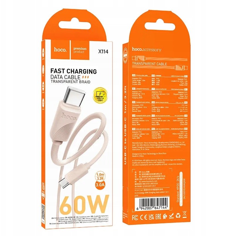 Καλώδιο USB C σε USB C HOCO 3A 60W 1 m X114 ροζ
