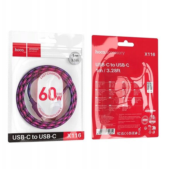 Καλώδιο USB C σε USB C HOCO 3A 60W 1 m X116 gradient μωβ