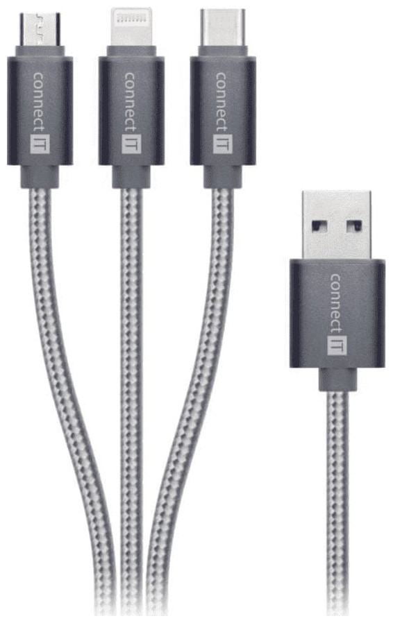 Uniwersalny kabel ładujący 3 w 1 do złączy Micro USB, Lightning i USB-C (typ C) do ładowania do trzech urządzeń jednocześnie, obsługujących szybkie ładowanie przy maksymalnym prądzie 2A. Micro USB, Lightning i USB-C (typ C) zapewniają lepszy dostęp do gniazd ładowania telefonu komórkowego w futerałach.Specjalny nylonowy warkocz premium z efektem metalicznej powierzchni gwarantuje wysoką elastyczność i trwałość. Wszystkie złącza są zamknięte w sztywnej aluminiowej obudowie z powietrzem. Wysokiej jakości materiał rdzenia o wystarczającym ogólnym przekroju pozwala na szybkie ładowanie.