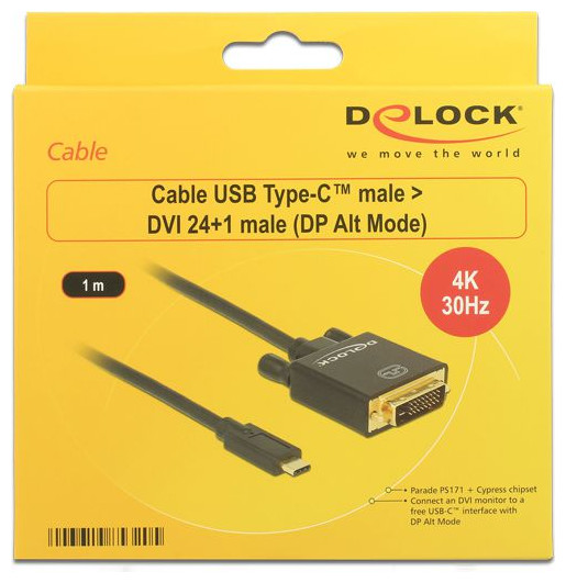 Αυτό το καλώδιο της Delock σάς επιτρέπει να συνδέσετε μια οθόνη DVI σε υπολογιστή ή φορητό υπολογιστή μέσω θύρας USB-C™ ή Thunderbolt™ 3, π.χ. MacBook ή Chromebook. Η υποδοχή πρέπει να υποστηρίζει την εναλλακτική λειτουργία Displayport.
