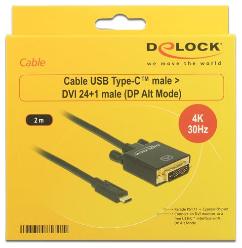 Αυτό το καλώδιο της Delock σάς επιτρέπει να συνδέσετε μια οθόνη DVI σε υπολογιστή ή φορητό υπολογιστή μέσω θύρας USB-C™ ή Thunderbolt™ 3, π.χ. MacBook ή Chromebook. Η υποδοχή πρέπει να υποστηρίζει την εναλλακτική λειτουργία Displayport.