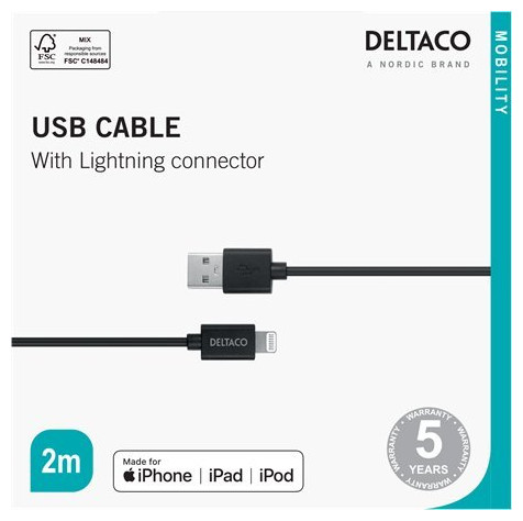 Deltaco IPLH-412. Μήκος καλωδίου: 2 m, Υποδοχή 1: USB A, Υποδοχή 2: Lightning, Έκδοση USB: USB 2.0, Χρώμα προϊόντος: Μαύρο{Plugin Type} Απλή προσθήκη . {Plugin Type} Απλή προσθήκη . {Μήκος καλωδίου} 2 m . {Μήκος καλωδίου} 2 m . {Χρώμα} Μαύρο. {Χρώμα} Μαύρο. {Τύπος καλωδίου} Αρσενικό - Αρσενικό . {Τύπος καλωδίου} Αρσενικό - Αρσενικό . {Connector 1} USB-A . {Connector 1} USB-A . {Πλεξούδα} Χωρίς πλέξη. {Πλεξούδα} Χωρίς πλέξη. {Standard} 2.0 . {Standard} 2.0 . {Συνδετήρας 2} Lightning . {Συνδετήρας 2} Lightning
