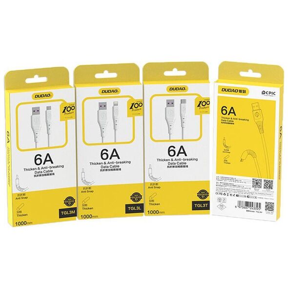Kabel, przewód USB – USB Typ C Dudao o natężeniu 6A i długości 1 m – biały (TGL3T)