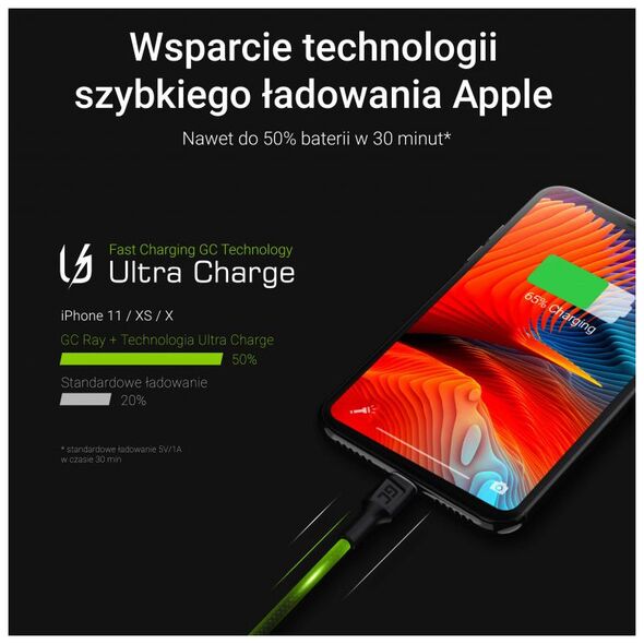 Για να μεγιστοποιήσουμε την ευκολία χρήσης καλωδίων GC Ray Lightning, τα έχουμε συνδυάσει σε ένα γενικό σύνολο τριών καλωδίων με το πιο συχνά επιλεγμένο μήκος. Τα καλώδια είναι επίσης εξοπλισμένα με λεπτό, λευκό οπίσθιο φωτισμό στο βύσμα Lightning. Αυτό καθιστά εξαιρετικά εύκολη την εύρεση τους στο σκοτάδι και τη σύνδεσή τους στη συσκευή σας, ενώ όταν συνδέονται σε έναν φορτιστή πολλαπλών θυρών, φαίνονται εξαιρετικά φουτουριστικά.