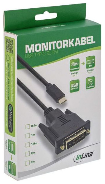 Προσαρμογέας InLine USB - DVI - USB Type C male to DVI male (DP Alt Mode) - μαύρο - 1m (100cm) Η InLine είναι μια γνωστή γερμανική μάρκα υψηλής ποιότητας που ειδικεύεται σε διάφορους τύπους προσαρμογέων και προσαρμογέων. Αυτή η εταιρεία ήταν η πρώτη στον κόσμο που παρουσίασε πολλούς τύπους προσαρμογέων χάρη στους οποίους μπορούμε να συνδέσουμε τη μια συσκευή στην άλλη χωρίς καμία προσπάθεια. Το προϊόν που προσφέρεται στο κατάστημά μας υπόκειται επίσης σε γερμανικό ποιοτικό έλεγχο, επομένως είμαστε σίγουροι από την αρχή ότι ο προσαρμογέας λειτουργεί, κάτι που δεν είναι πάντα στάνταρ με ανταγωνιστικούς προσαρμογείς, ειδικά λαμβάνοντας υπόψη ορισμένα σχόλια από τους τελικούς χρήστες Τα σημαντικότερα πλεονεκτήματα του προσαρμογέα InLine περιλαμβάνει υποστήριξη υψηλότερων αναλύσεων εικόνας διατηρώντας παράλληλα υψηλό εύρος ζώνης. Χρησιμοποιείται για τη σύνδεση οθονών DVI σε υπολογιστή με διασύνδεση USB Type-C και υποστήριξη Εναλλακτικής λειτουργίας DisplayPort: Βύσμα USB Type-C σε βύσμα DVI 24 + 1 Υποστηρίζει αναλύσεις έως 1.920 x 1.080 (1.080p) υπολογιστές Thunderbolt 3. υποστηρίζονται Συμβατά με USB 3.1 και VESA DisplayPort 1.2 για μετάδοση σήματος βίντεο Υποστηρίζει 3D συμβατό με HDCP 1.3 Τροφοδοτείται από τη θύρα USB, δεν χρειάζεται πρόσθετη ισχύ Επιχρυσωμένες επαφές για καλύτερη μετάδοση δεδομένων Plug & Play, π.χ. Plug and play Απαιτήσεις συστήματος: Windows 7/8/10, Mac OS 10.9 και νεότερο Υπολογιστής με δωρεάν θύρα USB Type-C που υποστηρίζει εναλλακτική λειτουργία DisplayPort ή υπολογιστή με δωρεάν θύρα Thunderbolt 3 Σημείωση: Υποστηρίζεται η εναλλακτική λειτουργία Το DisplayPort συνήθως υποδεικνύεται από το λογότυπο DisplayPort (D) στα δεξιά της θύρας Type-C.{Plugin Type} Απλή προσθήκη . {Plugin Type} Απλή προσθήκη . {Χρώμα} Μαύρο. {Χρώμα} Μαύρο. {Connector 1} USB-C . {Connector 1} USB-C . {Standard} 3.1. {Standard} 3.1. {Τύπος καλωδίου} Αρσενικό - Αρσενικό . {Τύπος καλωδίου} Αρσενικό - Αρσενικό . {Πλεξούδα} Χωρίς πλέξη. {Πλεξούδα} Χωρίς πλέξη. {Σύνδεση 2} DVI-D . {Σύνδεση 2} DVI-D . {Μήκος καλωδίου} 1 m . {Μήκος καλωδίου} 1 m