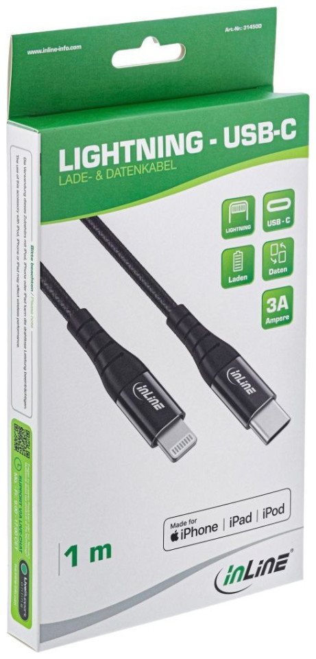 InLine 31450D. Długość kabla: 1 m. Złączka 1: Lightning, Złączka 2: USB C, Złącze 1: Męska. Ilość na paczkę: 1 szt., Rodzaj opakowania: Zawieszane pudełko