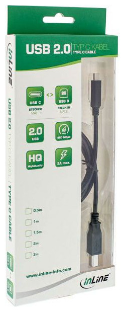 Καλώδιο InLine USB 2.0, τύπου C αρσενικό σε B αρσενικό, μαύρο, 2m Το καλώδιο USB 2.0 του γερμανικού κατασκευαστή InLine είναι κατάλληλο για ταχύτητες μεταφοράς δεδομένων έως και 480 Mbps Είναι ένα καλώδιο υψηλής ποιότητας με θωρακισμένους ομοαξονικούς πυρήνες που μπορεί να συνδεθεί σε σκληρούς δίσκους USB, κάρτες βίντεο USB, κ.λπ. με υποδοχή USB B, για σύνδεση σε κάρτα υποδοχής με θύρα USB Type C. Τεχνικά δεδομένα: Βύσμα USB Type C για Mini-B αρσενικό βύσμα (5 ακίδων) Υποστηρίζει τροφοδοτικό USB, καλώδιο έως 1 m με ρεύμα φόρτισης 3 Ampere, καλώδιο έως 5 m: 0,5 Ampere{Plugin Type} Απλή προσθήκη . {Plugin Type} Απλή προσθήκη . {Μήκος καλωδίου} 2 m . {Μήκος καλωδίου} 2 m . {Χρώμα} Μαύρο. {Χρώμα} Μαύρο. {Connector 1} USB-C . {Connector 1} USB-C . {Τύπος καλωδίου} Αρσενικό - Αρσενικό . {Τύπος καλωδίου} Αρσενικό - Αρσενικό . {Πλεξούδα} Χωρίς πλέξη. {Πλεξούδα} Χωρίς πλέξη. {Standard} 2.0 . {Standard} 2.0 . {Connector 2} USB-B . {Connector 2} USB-B