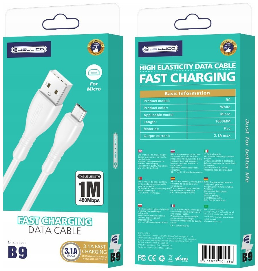 Καλώδιο USB Jellico JELLICO καλώδιο B9 Micro USB 3.1A 1M Λευκό
