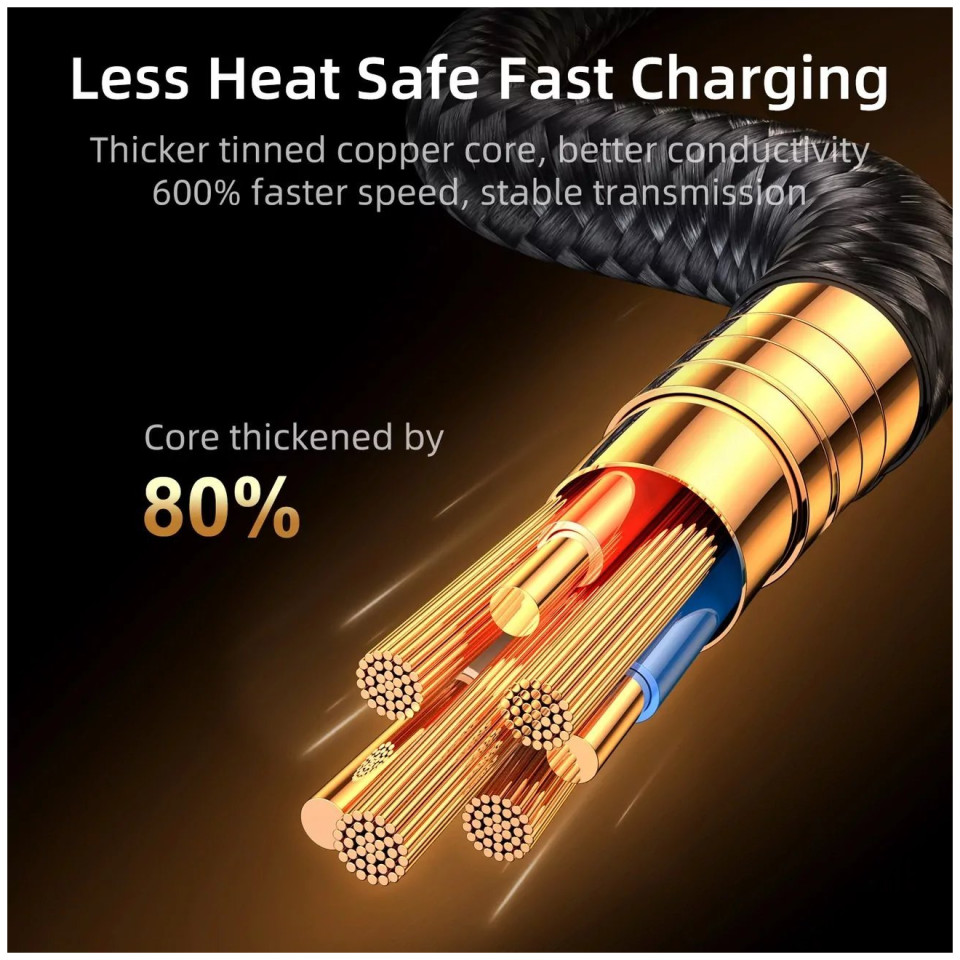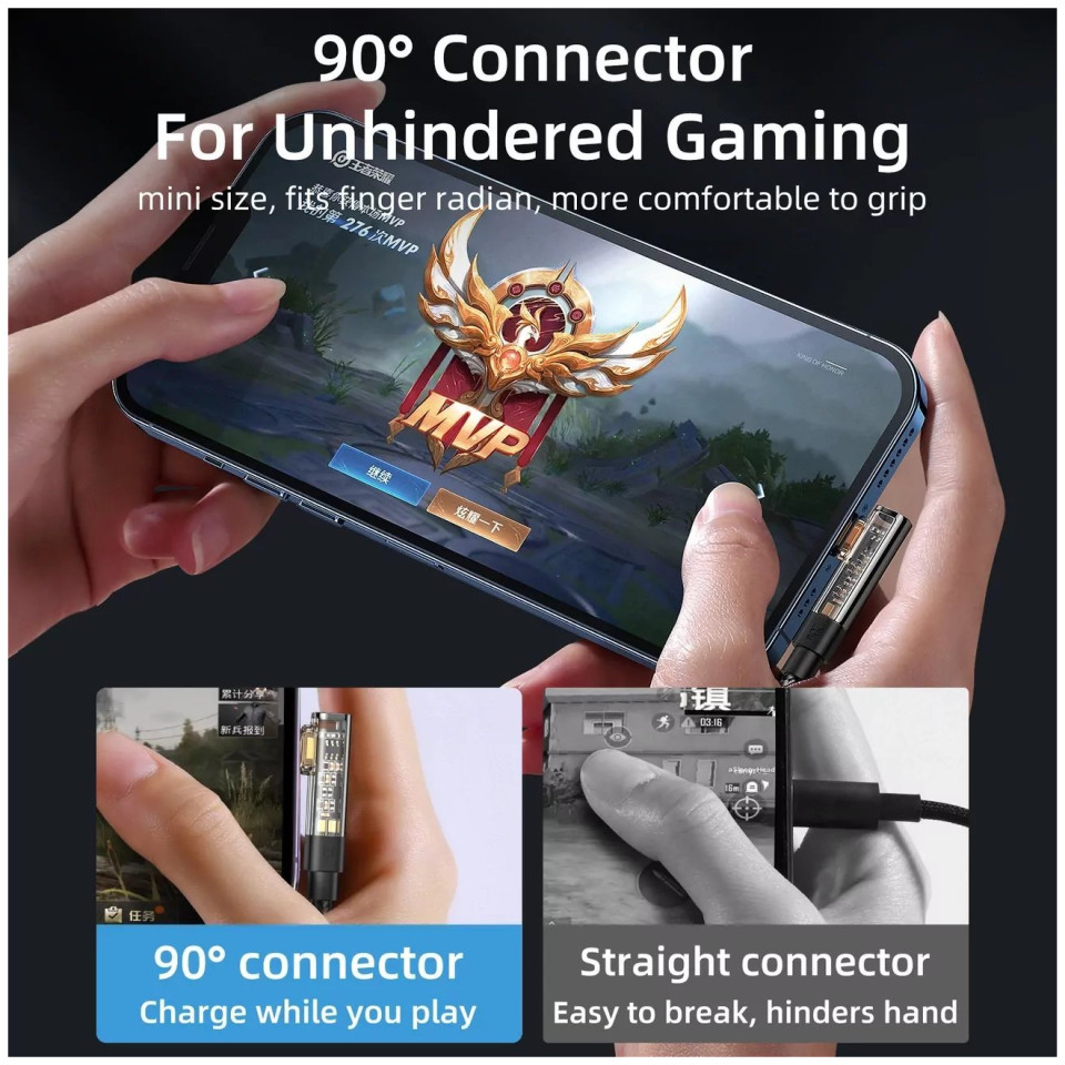 Kabel ma końcówkę pod kątem 90 stopni, więc umożliwia wygodne korzystanie ze smartfonu podczas ładowania. Pozwala na ładowanie prądem o natężeniu 2,4 A. Skraca czas ładowania urządzenia i zapewnia szybsze i bardziej efektywne korzystanie z telefonu.