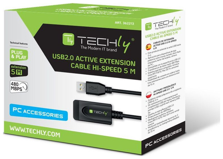 Ενεργό καλώδιο USB Techly IUSB-REP20TY, P/N: 362213 – Ενεργό καλώδιο επέκτασης USB 2.0 A-A M/F 5m Μαύρο