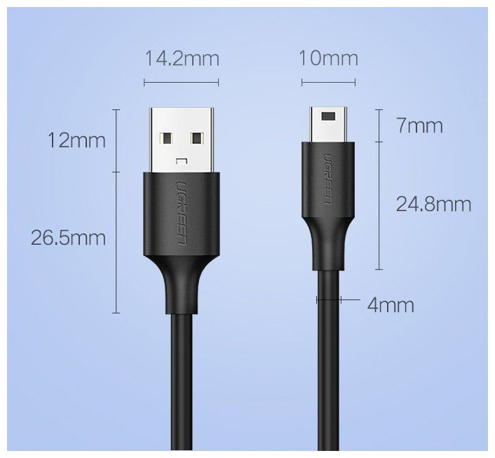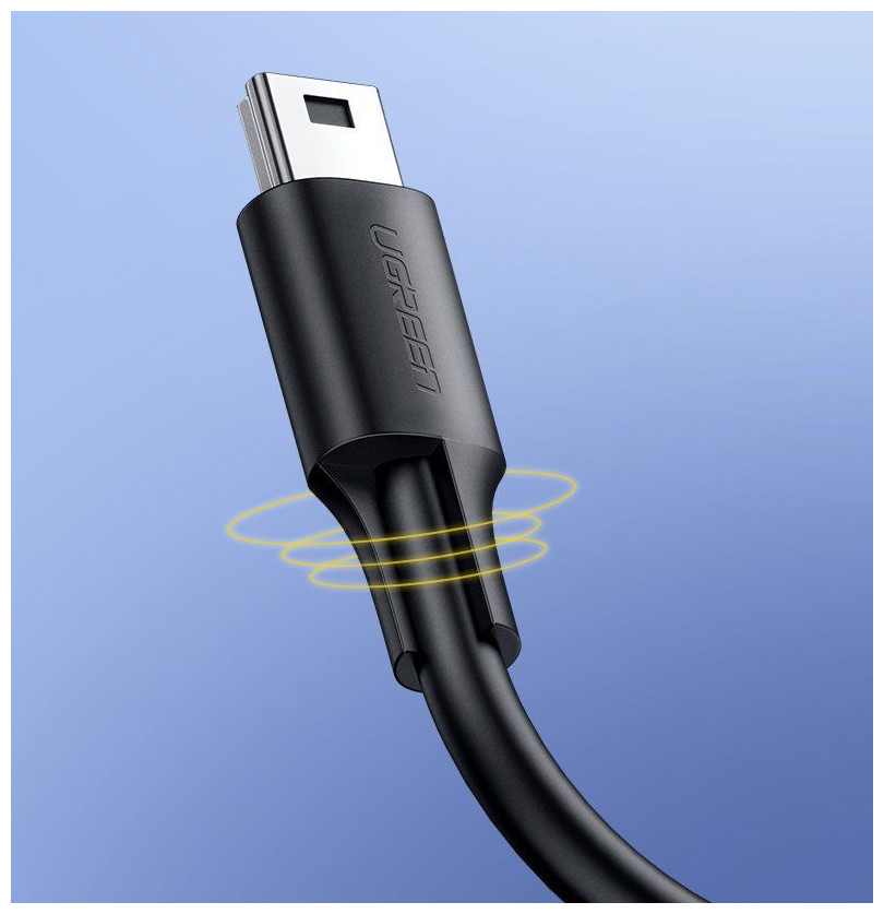 Καλώδιο USB υψηλής ποιότητας από την Ugreen για όλες τις συσκευές εξοπλισμένες με υποδοχή mini USB. Χρησιμοποιώντας το, μπορούμε να συγχρονίσουμε γρήγορα δεδομένα και να φορτίσουμε με ασφάλεια τον εξοπλισμό μας. Μπορεί να χρησιμοποιηθεί, για παράδειγμα, για τη σύνδεση ψηφιακών φωτογραφικών μηχανών με θύρα μίνι USB σε υπολογιστή.