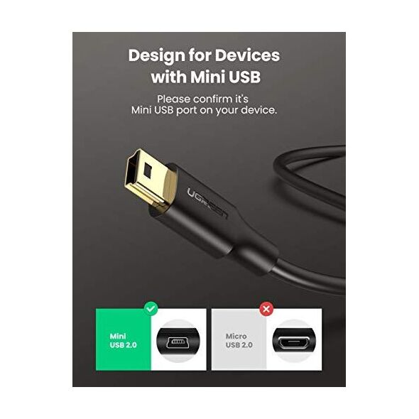 Το καλώδιο mini USB UGREEN είναι ιδανικό για τη σύνδεση συσκευών με θύρα mini USB σε υπολογιστή σε θύρα USB 2.0. Σας επιτρέπει να μεταφέρετε δεδομένα και να φορτίζετε συσκευές. (Βεβαιωθείτε ότι η συσκευή σας διαθέτει θύρα mini USB και όχι θύρα micro USB.)