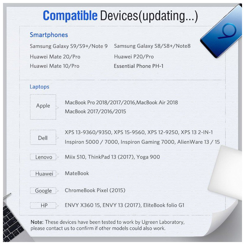 Laptopy: Apple MacBook Pro 2018/2017/2016, MacBook Air 2018, MacBook 2017/2016/2015; Dell XPS 13-9360/9350, XPS 15-9560, XPS 12-9250, XPS 13 2in1, Inspiron 5000/7000, Inspiron Gaming 7000, AlienWare 13/15; Lenovo Miix 510, ThinkPad 13 (2017), Yoga 900; Huawei MateBook; Google ChromeBook Pixel (2015); HP Envy X360 15, Envy 13 (2017), EliteBook Folio G1