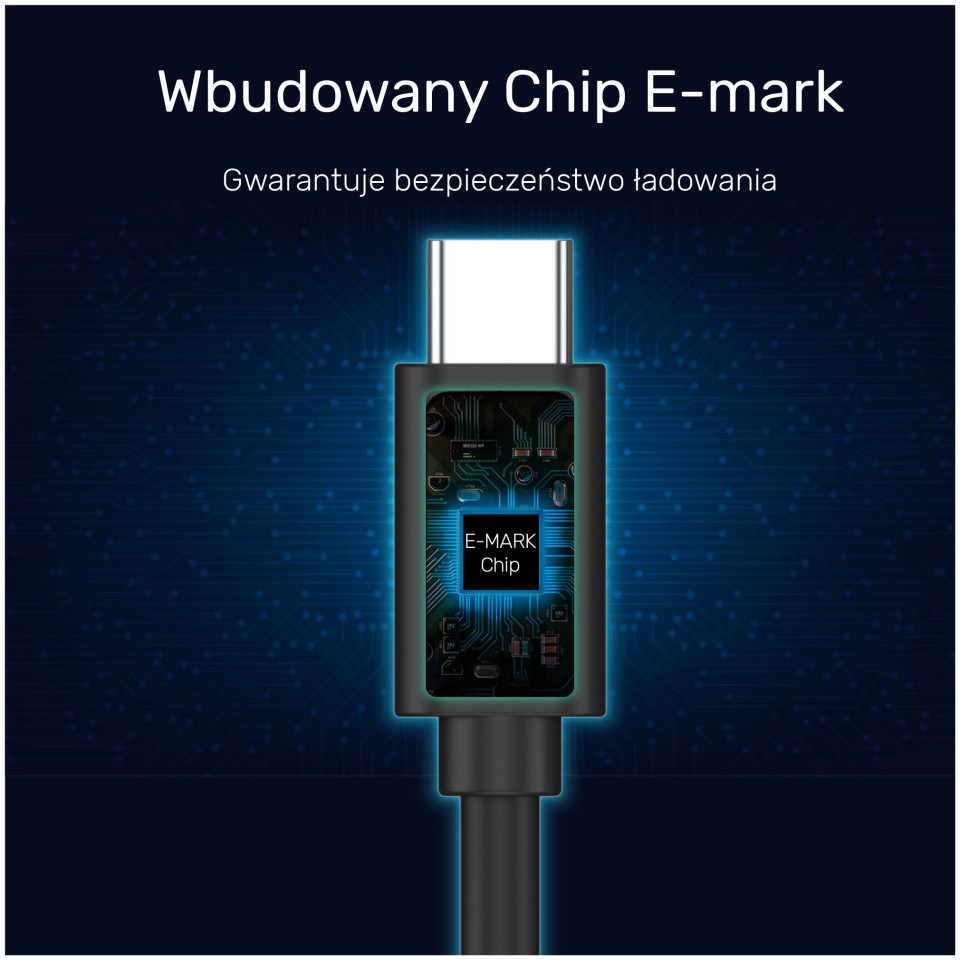 Η τεχνολογία Power Delivery σάς επιτρέπει να τροφοδοτείτε μέσω USB όχι μόνο smartphone και tablet, αλλά και μεγάλες συσκευές όπως notebook, π.χ. Το ρεύμα των 5Α σε συνδυασμό με την τάση των 20 V μας δίνει ισχύ 100W. Το τσιπ E-Mark που είναι ενσωματωμένο στις μύτες εξασφαλίζει ασφάλεια φόρτισης. Να θυμάστε ότι η τελική ισχύς φόρτισης θα εξαρτηθεί από τις άλλες συνδεδεμένες συσκευές, δεν υποστηρίζουν όλες την Power Delivery.