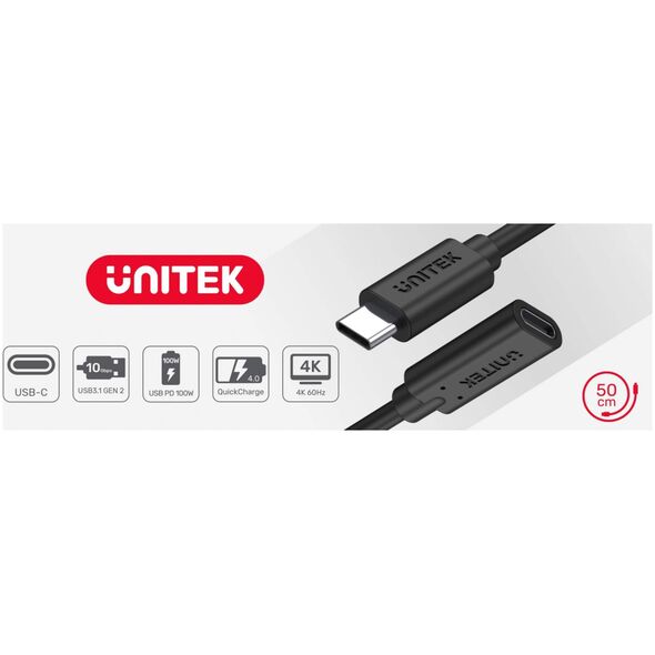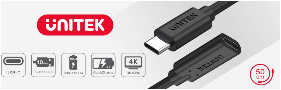 Μερικές φορές χρειάζεστε μόνο μερικά ακόμη εκατοστά καλωδίου. Και εδώ έρχεται το καλώδιο επέκτασης Unitek USB-C 3.1. Όλα σε μαύρο χρώμα. Ως ένα από τα λίγα καλώδια επέκτασης USB-C, είναι πλήρως συμβατό με το πρότυπο USB 3.1 Gen2, πράγμα που σημαίνει ότι παρέχει ρυθμό μεταφοράς 10 Gb ανά δευτερόλεπτο, φόρτιση 100 W και βίντεο 4K.