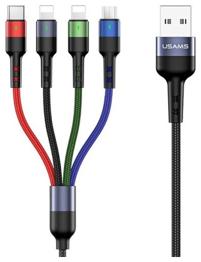 Το πλεγμένο καλώδιο USAMS U26 US-SJ411 είναι ένα προϊόν κυριολεκτικά για όλους. Τέσσερις συμβουλές (2xlighthning, microUSB και USB-C) σάς επιτρέπουν να φορτίζετε 4 συσκευές ταυτόχρονα. Το καλώδιο επιτρέπει γρήγορη ροή ρεύματος έως και 2A και μεταφορά δεδομένων στην περίπτωση των συσκευών Apple - Ένα έξυπνο ολοκληρωμένο κύκλωμα που θα προστατεύει τη συσκευή μας από απροσδόκητες υπερτάσεις - Απαλή ενδεικτική λυχνία φόρτισης - Ενισχυμένες άκρες με εύκαμπτο υλικό - Υλικό: Ύφανση από νάιλον + κράμα αλουμινίου, εύκαμπτο και ανθεκτικό στη χρήση - Πυρήνα από καθαρό χάλκινο, ασφαλή και γρήγορη φόρτιση - Παρέχει γρήγορη φόρτιση έως και 2A - Το κέλυφος από αλουμίνιο και η πλέξη από νάιλον εξασφαλίζουν μεγάλη διάρκεια. Προστασία από υπερτάσεις, ασφαλής στη χρήση - Ανθεκτικό στην κάμψη - Μήκος: 0,35 m{Plugin Type} Απλή προσθήκη . {Χρώμα} Μαύρο. {Μήκος καλωδίου} 0,35 m . {Cable Type} Αρσενικό - Αρσενικό . {Braid} Με πλεξούδα. {Connector 1} USB-A . {Standard} 3.0 . {Connector 2} USB-C + microUSB + 2x Lightning
