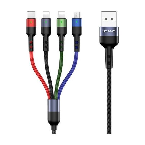 Pleciony kabel USAMS U26 US-SJ413 to produkt dosłownie dla każdego. Cztery końcówki (2xlighning, microUSB i USB-C) umożliwiają naładowanie 4 urządzeń jednocześnie. Kabel pozwala na szybki przepływ prądu o wartości do 2A oraz transfer danych w przypadku urządzeń Apple.Nylonowy splot zapewni długie i bezawaryjne użytkowanie przewodu, bez ryzyka mechanicznych uszkodzeń.Kabel wyposażony w Smart Chip - inteligentny układ scalony, który zabezpieczy nasze urządzenie przed niespodziewanymi przepięciami.- Delikatne światło wskaźnika ładowania- Wzmocnione końcówki elastycznym materiałem- Materiał: Nylonowy splot + stop aluminium, elastyczny i trwały w użyciu.- Czysty, grubszy rdzeń miedziany, bezpieczne i szybkie ładowanie.- Zapewnia szybkie ładowanie do 2A.- Powłoka aluminiowa i pleciony nylonowy splot zapewnia długą żywotność.- Inteligentny układ. Zabezpieczenia przed przepięciami, bezpieczny w użyciu.- Konstrukcja odporna na zginanie.- Długość: 3 m