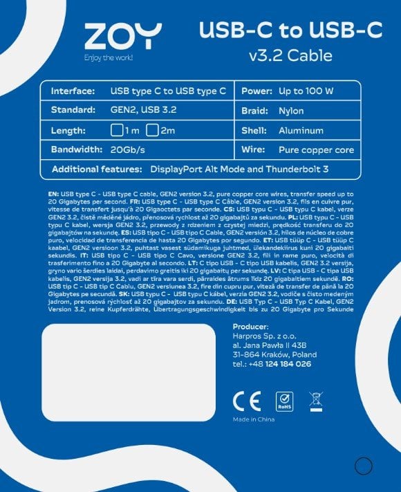 Καλώδιο USB ZOY USB C - USB C standard 3.2 2m ZCCC2