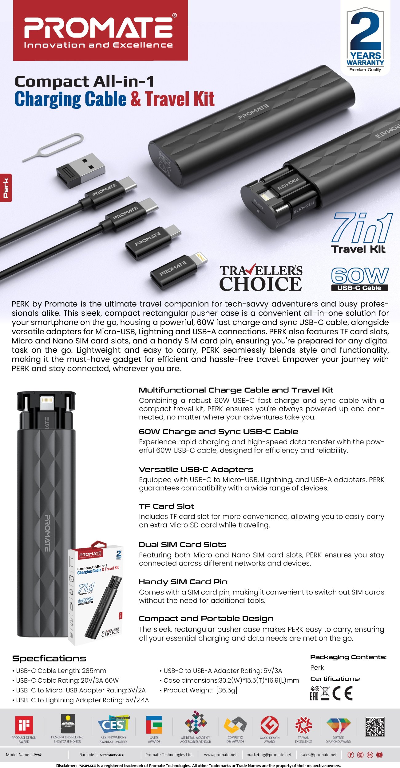 Promate Perk Compact 4-in-1 Cable and Adapter Set USB-C / micro / Lightning/ 0.3m