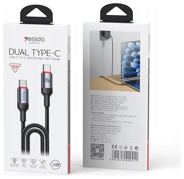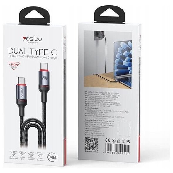 Καλώδιο Yesido CA186 240W Type-C/Type-C 2m 5A, ΜΑΥΡΟ