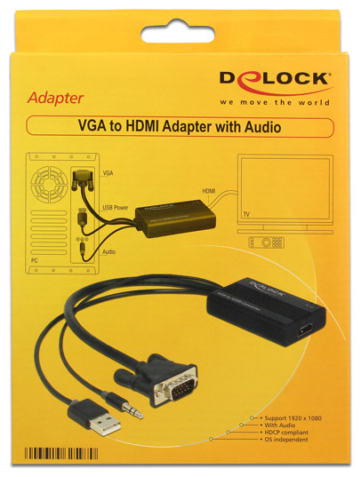 Delock VGA + Προσαρμογέας ήχου σε HDMI AV. Προϊόν σε μαύρο χρώμα.{Επιχρυσωμένο βύσμα} Αρ. {Επιχρυσωμένο βύσμα} Αρ. {Γωνιακό βύσμα} Αρ. {Γωνιακό βύσμα} Αρ. {Χρώμα} μαύρο . {Χρώμα} μαύρο . {Τύπος βυσμάτων} Βύσμα - Πρίζα. {Τύπος βυσμάτων} Βύσμα - Πρίζα. {Τύπος σύνδεσης} D-Sub (VGA) - HDMI + USB-A + Jack 3,5 mm. {Τύπος σύνδεσης} D-Sub (VGA) - HDMI + USB-A + Jack 3,5 mm
