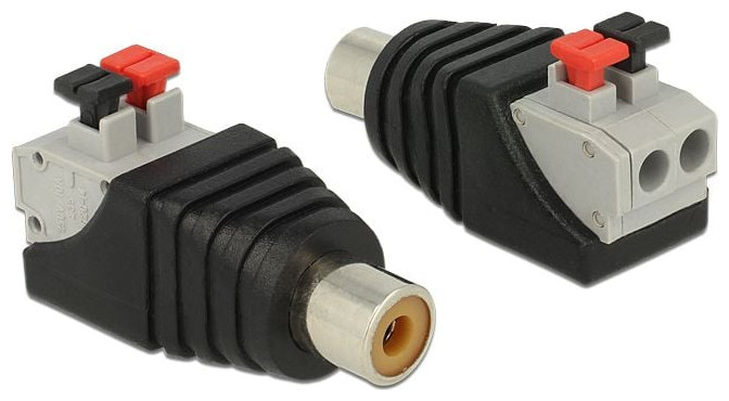 Προσαρμογέας RCA θηλυκό στο Terminal Block 2pin με κουμπιά της Delock.{Επιχρυσωμένο βύσμα} Αρ. {Γωνιακό βύσμα} Αρ. {Χρώμα} μαύρο . {Τύπος βυσμάτων} Πρίζα - Πρίζα . {Connector type} Μπλοκ τερματικού