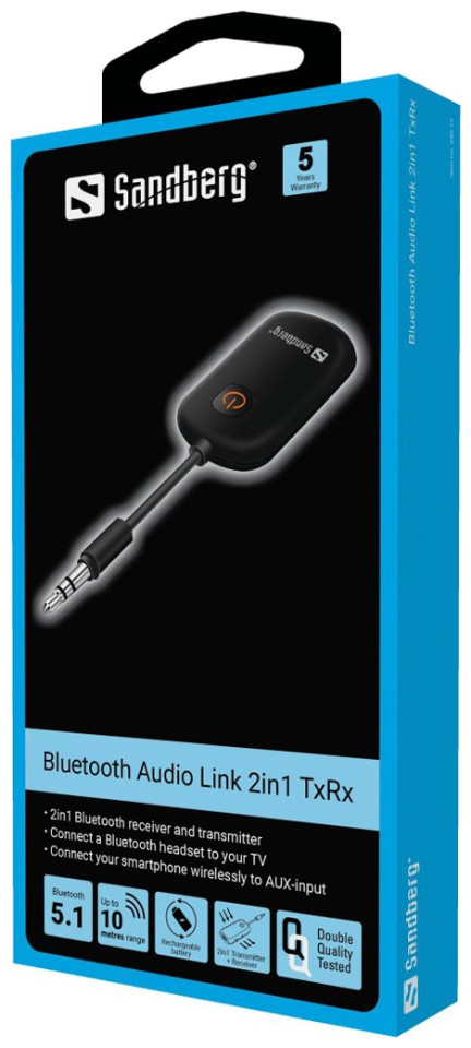 Ο προσαρμογέας Sandberg Bluetooth Audio Link 2in1 TxRx σας επιτρέπει να στέλνετε και να λαμβάνετε ασύρματα σήματα ήχου μέσω τεχνολογίας Bluetooth. Αφού το διαμορφώσετε ως πομπό (Tx), μπορείτε να στείλετε το σήμα ήχου από την έξοδο του σετ μικροφώνου-ακουστικού, για παράδειγμα, σε μια τηλεόραση συνδεδεμένη σε ακουστικά Bluetooth. Μετά τη διαμόρφωση του ως δέκτη (Rx), μπορεί να χρησιμοποιηθεί για τη σύνδεση μιας συσκευής Bluetooth, π.χ. ενός κινητού τηλεφώνου, μέσω της υποδοχής AUX στο ηχοσύστημα του αυτοκινήτου για να ακούτε μουσική που μεταδίδεται ασύρματα από το τηλέφωνο.{Εύρος} 10 μ. {Εύρος} 10 μ. {Χρώμα} Μαύρο. {Χρώμα} Μαύρο. {Plug & Play}Αρ. {Plug & Play}Αρ. {Υποστηριζόμενα λειτουργικά συστήματα} Δεν ισχύει . {Υποστηριζόμενα λειτουργικά συστήματα} Δεν ισχύει . {Connector} MiniJack 3,5 mm. {Connector} MiniJack 3,5 mm. {Bluetooth Standard} 5.1 . {Bluetooth Standard} 5.1