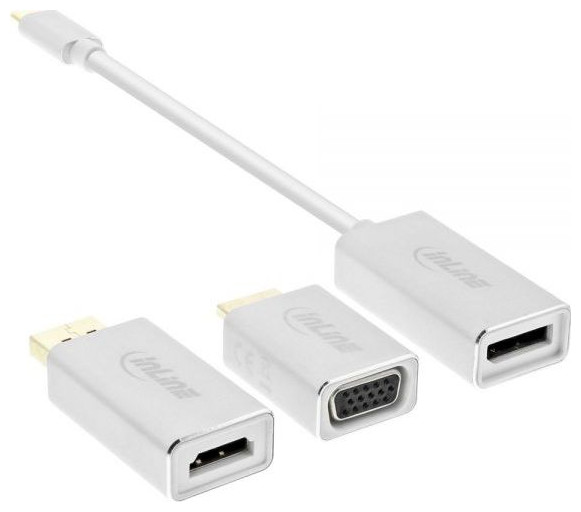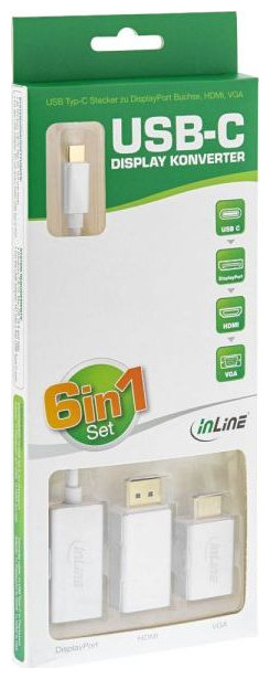 USB Display Inline Adapter, 6-in-1, USB Type-C Male to DisplayPort Female, HDMI, VGA (DP Alt Mode), 4K2K, Silver, 0,2 m Αυτό το κιτ προσαρμογέα από τη γερμανική μάρκα InLine προσφέρει τη δυνατότητα υποστήριξης οθονών με Θύρα DisplayPort, HDMI ή VGA στη θύρα USB Type-C του υπολογιστή σας. Επιπλέον, κάθε μεμονωμένος προσαρμογέας μπορεί να μετατρέψει τη διεπαφή ξεχωριστά ή σε συνδυασμό, επομένως το σετ προσφέρει συνολικά 6 πιθανές εφαρμογές: 1. USB Type-C σε DisplayPort 2. DisplayPort σε HDMI 3. HDMI σε VGA 4. USB Type-C σε HDMI 5. DisplayPort σε VGA 6. USB Type C σε VGA Τεχνικά δεδομένα: Μέγιστες αναλύσεις: για DisplayPort 3840 x 2160 @ 60Hz, για HDMI 3840 x 2160 @ 30 Hz, για VGA 1920 x 1080 @ 60 Hz Προσαρμογέας σε αλουμινένιο περίβλημα Υποστηρίζει τις ακόλουθες προδιαγραφές: USB 3.1, DisplayPort 1.2 και HDMI 1.4b Μήκος καλωδίου 10 cm περίπου με οθόνη USB 3.3 υποστηρίζεται Τροφοδοτείται από USB, όχι απαιτεί τροφοδοσία Plug & Play Η υποστήριξη εναλλακτικής λειτουργίας DisplayPort συνήθως επισημαίνεται με το λογότυπο DisplayPort (D) στα δεξιά της θύρας USB Type-C Απαιτήσεις συστήματος: Windows 7/8/10, Mac OS 10.9 και νεότερη έκδοση Απαιτήσεις προσαρμογέα USB: υπολογιστής με μια δωρεάν θύρα USB Type-C C που υποστηρίζει την εναλλακτική λειτουργία DisplayPort ή έναν υπολογιστή με δωρεάν θύρα Thunderbolt 3{Angle Plug} Αρ. {Angle Plug} Αρ. {Angle Plug} Αρ. {Angle Plug} Αρ. {Χρώμα} Λευκό. {Χρώμα} Λευκό. {Χρώμα} Λευκό. {Χρώμα} Λευκό. {Type of connectors} USB-C - DisplayPort. {Type of connectors} USB-C - DisplayPort. {Type of connectors} USB-C - DisplayPort. {Type of connectors} USB-C - DisplayPort. {Πρότυπο υποδοχής USB} 3.1. {Πρότυπο υποδοχής USB} 3.1. {Πρότυπο υποδοχής USB} 3.1. {Πρότυπο υποδοχής USB} 3.1. {Τύπος βυσμάτων} Βύσμα - Πρίζα. {Τύπος βυσμάτων} Βύσμα - Πρίζα. {Τύπος βυσμάτων} Βύσμα - Πρίζα. {Τύπος βυσμάτων} Βύσμα - Πρίζα. {Type} Προσαρμογέας . {Type} Προσαρμογέας . {Type} Προσαρμογέας . {Type} Προσαρμογέας . {Application} IT . {Application} IT . {Application} IT . {Application} IT