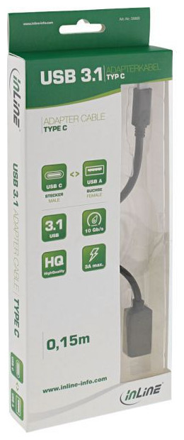 Καλώδιο προσαρμογέα USB 3.1 InLine, Type C Male - A Female, Black, 0,15m Το καλώδιο προσαρμογέα USB 3.1 από τη γερμανική μάρκα InLine είναι ένα ποιοτικό καλώδιο με θωρακισμένους ομοαξονικούς πυρήνες, το οποίο είναι κατάλληλο για μεταφορά δεδομένων σε ταχύτητες έως και 10 Gb/s .Ένα επιπλέον πλεονέκτημα των καλωδίων InLine Το USB ορατό στο κατάστημά μας είναι γεγονός γερμανικού ποιοτικού ελέγχου. Κάθε προϊόν ελέγχεται πριν από τη συσκευασία, επομένως μπορούμε να είμαστε σίγουροι ότι αγοράζουμε ένα καλώδιο USB που λειτουργεί. Σύνδεση στον κεντρικό υπολογιστή της κάρτας με θύρα USB Type-C Υποστηρίζει τροφοδοσία USB έως και συμβατό ρεύμα φόρτισης 3 αμπέρ{Γωνιακό βύσμα} Αρ. {Γωνιακό βύσμα} Αρ. {Χρώμα} Μαύρο. {Χρώμα} Μαύρο. {Πρότυπο υποδοχής USB} 3.1. {Πρότυπο υποδοχής USB} 3.1. {Τύπος υποδοχών} USB-C - USB . {Τύπος υποδοχών} USB-C - USB . {Τύπος βυσμάτων} Βύσμα - Πρίζα. {Τύπος βυσμάτων} Βύσμα - Πρίζα. {Type} Προσαρμογέας . {Type} Προσαρμογέας . {Χρήση} TELE . {Χρήση} TELE . {Application} IT . {Application} IT