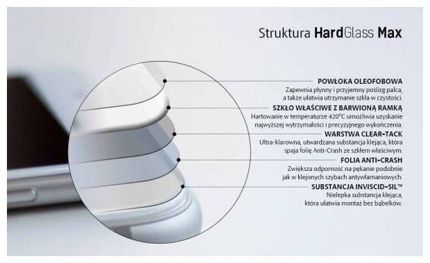 Το σκληρυμένο γυαλί, το οποίο είναι ένα από τα λίγα στην αγορά, θα προστατεύσει πλήρως μια στρογγυλεμένη οθόνη χάρη στη χρήση της τεχνολογίας 3D Edge, καλύπτοντας τέλεια ολόκληρη την οθόνη, συμπεριλαμβανομένων των καμπυλωτών άκρων. Ανθεκτικό στις ρωγμές, σκληρότητα 9H, εμπλουτισμένο με αλουμινόχαρτο Anti-Crash αυξάνει την αντοχή της οθόνης. Το εξαιρετικά λεπτό (0,3 mm) διατηρεί την πραγματική αίσθηση του γυαλιού, εξασφαλίζοντας εξαιρετική ευαισθησία απόκρισης της οθόνης. Πολύ καλά τοποθετημένο, χάρη στην τεχνολογία παραγωγής λέιζερ έχει ακριβείς εγκοπές για τους αισθητήρες και την κάμερα. Εξαιρετικά εύκολο στην εγκατάσταση, χάρη στην ουσία Inviscid-Sil™, δεν αφήνει φυσαλίδες και η πλήρης κάλυψη των άκρων βοηθά επιπλέον κατά την εφαρμογή γυαλιού. Το HardGlass Max οφείλει την ομαλή και ευχάριστη ολίσθηση του δακτύλου του σε μια πρόσθετη ελαιοφοβική επίστρωση που βοηθά να διατηρείται το γυαλί καθαρό. Δεν συνιστάται ο συνδυασμός της θήκης με γυαλί.