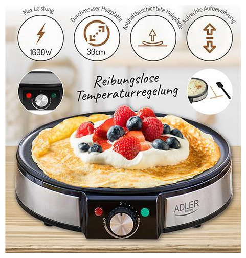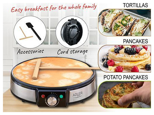 Οι τηγανίτες είναι από εκείνα τα πιάτα που αρέσουν τόσο σε παιδιά όσο και σε μεγάλους. Επομένως, η συσκευή παρασκευής τηγανιτών ADLER AD 3058 είναι μια συσκευή που μπορεί να χρησιμοποιηθεί στα περισσότερα σπίτια. Μπορείτε να ετοιμάσετε γρήγορα και άνετα σνακ για πρωινό και απογευματινό τσάι, καθώς και το κυρίως πιάτο για δείπνο. Η πολυλειτουργικότητα, η κομψή εμφάνιση και η ευκολία αποθήκευσης είναι μερικά μόνο χαρακτηριστικά αυτού του ενδιαφέροντος εξοπλισμού από τα συστατικά , που βρίσκονται σε κάθε σπίτι, είναι πολύ δημοφιλή. Αρέσουν σε παιδιά και μεγάλους και μπορούν να σερβιριστούν οποιαδήποτε στιγμή της ημέρας, ως κυρίως πιάτο ή σνακ. Οι καλοφαγάδες θα χρειαστούν μια συσκευή που θα τους βοηθήσει να τηγανιστούν. Προτείνουμε έναν επαγγελματία παρασκευαστή τηγανιτών του οποίου η αντικολλητική επίστρωση της πλάκας θέρμανσης, το σχήμα και το ψηλό χείλος που εμποδίζει τη χύση της ζύμης θα διευκολύνει το τηγάνισμα των τηγανιτών, αλλά και των τορτίγιας, τηγανητές. και τηγανίτες πατάτας. Θα είναι μια σημαντική προσθήκη στον εξοπλισμό, χάρη στον οποίο μπορούμε εύκολα να ετοιμάσουμε τηγανίτες ακόμα και για μεγαλύτερο αριθμό ατόμων. Η διάμετρος της πλάκας θέρμανσης είναι 30 cm, που σημαίνει ότι μπορείτε εύκολα να τηγανίσετε τηγανίτες με γέμιση Πώς λειτουργεί η συσκευή παρασκευής τηγανίτας και δύο ενδεικτικές λυχνίες υποδεικνύουν πότε ο εξοπλισμός είναι έτοιμος για λειτουργία ότι το τροφοδοτικό λειτουργεί όπως θα έπρεπε. Τα σταθερά λαστιχένια πόδια εμποδίζουν την ολίσθηση της pancake maker στον πάγκο. Το περίβλημα από ανοξείδωτο χάλυβα και η αποθήκευση του καλωδίου τροφοδοσίας κάνουν τη συσκευή να μας εξυπηρετεί για πολλά χρόνια και είναι πολύ εύκολη στην αποθήκευση, ακόμη και σε κάθετη θέση. Το καλώδιο ρεύματος μήκους 75 cm θα διευκολύνει την απρόσκοπτη και άνετη σύνδεση του εξοπλισμού στο τροφοδοτικό Το σετ περιλαμβάνει επίσης αξεσουάρ για το άπλωμα της ζύμης και το γύρισμα της τηγανίτας. Χρησιμοποιήστε μια ειδική σπάτουλα για να ισοπεδώσετε την επιφάνεια του κέικ και με μια σπάτουλα αναποδογυρίστε το μετά το ψήσιμο και αφαιρέστε το σε πιατέλα χωρίς να χρειαστεί να χρησιμοποιήσετε μεταλλικά εργαλεία. Ανάλογα με τις γευστικές σας προτιμήσεις, η ρύθμιση χαμηλότερης θερμοκρασίας θα έχει ως αποτέλεσμα ελαφριές τηγανίτες, ενώ υψηλότερη θερμοκρασία θα έχει ως αποτέλεσμα πιο σκούρες και πιο τραγανές τηγανίτες.{Ισχύς} 1600 W . {Ισχύς} 1600 W . {Ισχύς} 1600 W . {Ισχύς} 1600 W . {Ισχύς} 1600 W . {Ισχύς} 1600 W . {Ισχύς} 1600 W . {Ισχύς} 1600 W