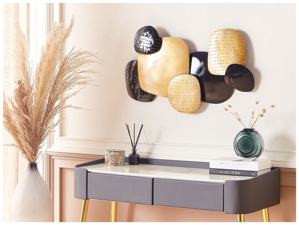 Η Beliani είναι κατασκευαστής επίπλων από την Ελβετία, με παρουσία σε 17 χώρες και ένα από τα ταχύτερα αναπτυσσόμενα ηλεκτρονικά καταστήματα στην Πολωνία HAFNIUM Εμπλουτίστε τον εσωτερικό σας χώρο με μια κομψή διακόσμηση τοίχων σε μαύρο και χρυσό. Χειροποίητο από μέταλλο, είναι ένα μοναδικό διακοσμητικό στοιχείο που θα προσθέσει γοητεία σε ένα μοντέρνο εσωτερικό. Κρεμάστε το και απολαύστε τη μοναδική ομορφιά του, τόσο για εσάς όσο και για τους καλεσμένους σας. Η καταχώριση περιλαμβάνει: 1 x Κρεμαστό Διακόσμηση Κατάσταση: Λεπτομέρειες: Χρώμα: Μαύρο, Χρυσό Υλικό: Σίδερο Βάρος: 1 kg Συναρμολόγηση: Δεν απαιτείται συναρμολόγηση Πρόσθετες πληροφορίες: Πλάτος: 80 cm Βάθος: 5 cm Ύψος: 48 cm Χαρακτηριστικά προϊόντος Γάντζοι τοποθέτησης στο πίσω μέρος του προϊόντος επιτρέπουν την ανάρτηση στον τοίχο Κομψό, μοναδικό εσωτερικό στοιχείο Ιδανικό τόσο για την κρεβατοκάμαρα όσο και για το σαλόνι Υψηλή ποιότητα κατασκευής Χειροποίητο Συμβουλές madeCare: Καθαρίστε μέταλλο με ήπιο καθαριστικό και μαλακό πανί και μετά από υγρό σκούπισμα, σκουπίστε τα στοιχεία από χαλκό ή χρώμιο, χρησιμοποιήστε κατάλληλα γυαλιστικά για να αποφύγετε τις γρατσουνιές{Type} Μενταγιόν . {Type} Μενταγιόν . {Type} Μενταγιόν . {Type} Μενταγιόν . Μενταγιόν {Type}