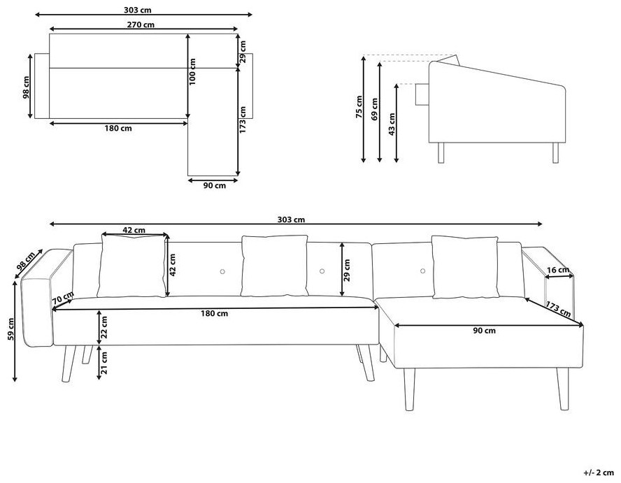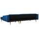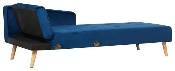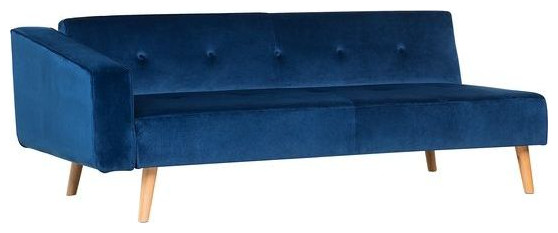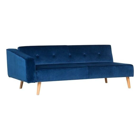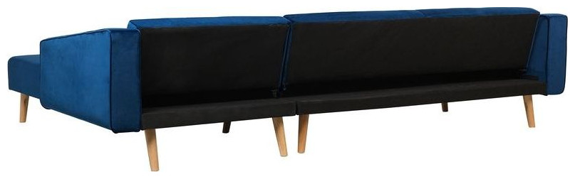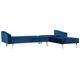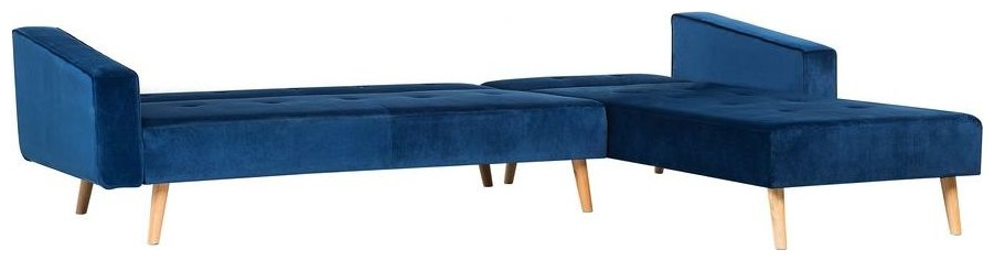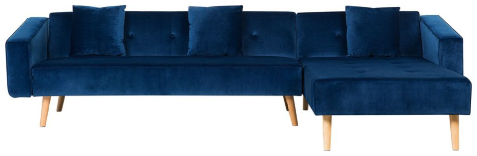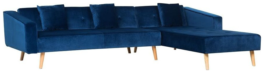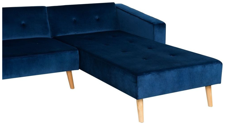 Ένας κομψός γωνιακός καναπές σε ρετρό στυλ που θα ταιριάζει απόλυτα στο εσωτερικό σας. Η βελούδινη ταπετσαρία του σε κλασικό μπλε χρώμα θα λειτουργήσει τέλεια τόσο σε μοντέρνες όσο και σε παραδοσιακές συνθέσεις. Ο καναπές διαθέτει επιπλέον, ασορτί διακοσμητικά μαξιλάρια και αναδιπλούμενη πλάτη, χάρη στην οποία μπορείτε εύκολα να δημιουργήσετε έναν χώρο ύπνου για τους καλεσμένους σας. Η σεζλόνγκ βρίσκεται στην αριστερή πλευρά του καναπέ από την οπτική γωνία του ατόμου που κάθεται. Ύψος: 72