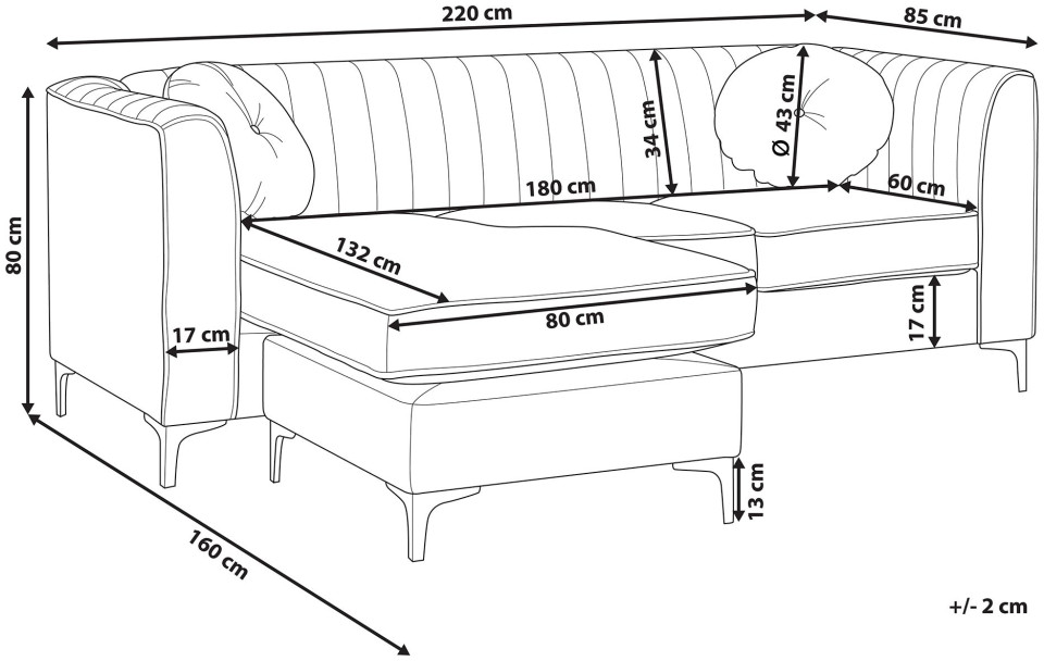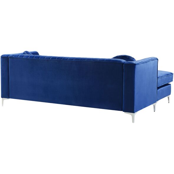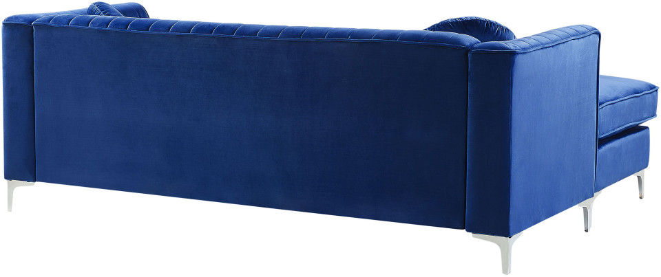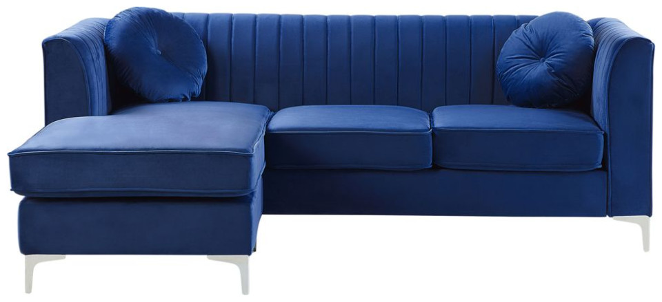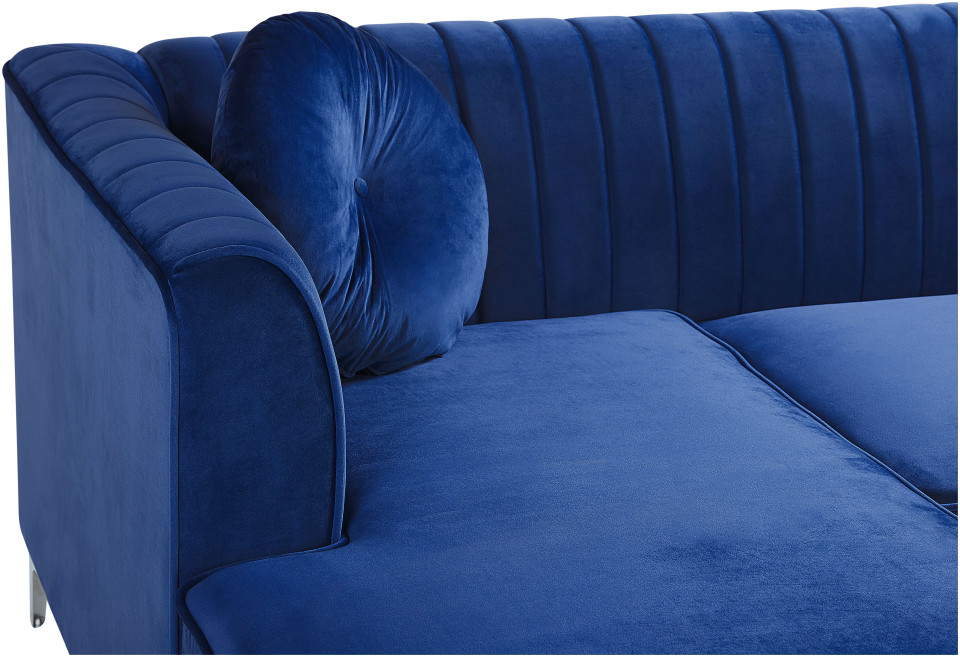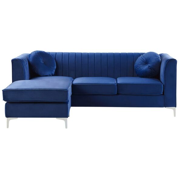 Με κομψή, διακοσμητική πλάτη, ψηλά μπράτσα, πολυτελείς βελούδινες ταπετσαρίες και λαμπερά ασημένια πόδια, αυτός ο γωνιακός καναπές είναι η τέλεια προσθήκη σε κάθε λαμπερό σαλόνι. Διαθέτει δύο επιπλέον στρογγυλά μαξιλάρια που υποστηρίζουν την πλάτη σας ενώ παρακολουθείτε ταινία ή το κεφάλι σας ενώ κοιμάστε. Η αρθρωτή δομή του καναπέ σας επιτρέπει να τοποθετήσετε τη σεζλόνγκ στην αριστερή ή στη δεξιά πλευρά και να αναδιατάξετε το σαλόνι ανά πάσα στιγμή. Ύψος: 80