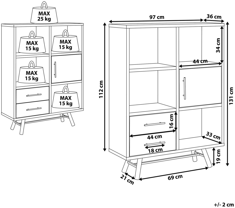 Προσθέστε τάξη και στυλ στο εσωτερικό σας με αυτήν την κομψή και λειτουργική συρταριέρα. Θα είναι τέλειο για σαλόνι ή υπνοδωμάτιο σε μινιμαλιστικό ή σκανδιναβικό στυλ. Σε δύο ευρύχωρα συρτάρια και δύο ράφια μπορείτε να χωρέσετε μια συλλογή από παιχνίδια, δίσκους, αναμνηστικά ταξιδιού και άλλα μικροαντικείμενα. Το ράφι είναι κατασκευασμένο από υψηλής ποιότητας σανίδα, η οποία είναι πολύ εύκολη στη συντήρηση και ανθεκτική. Τέσσερα μεταλλικά πόδια εξασφαλίζουν τη σταθερότητα του ντουλαπιού. Ο τέλειος συνδυασμός λειτουργικότητας και στυλ. Ύψος: 131