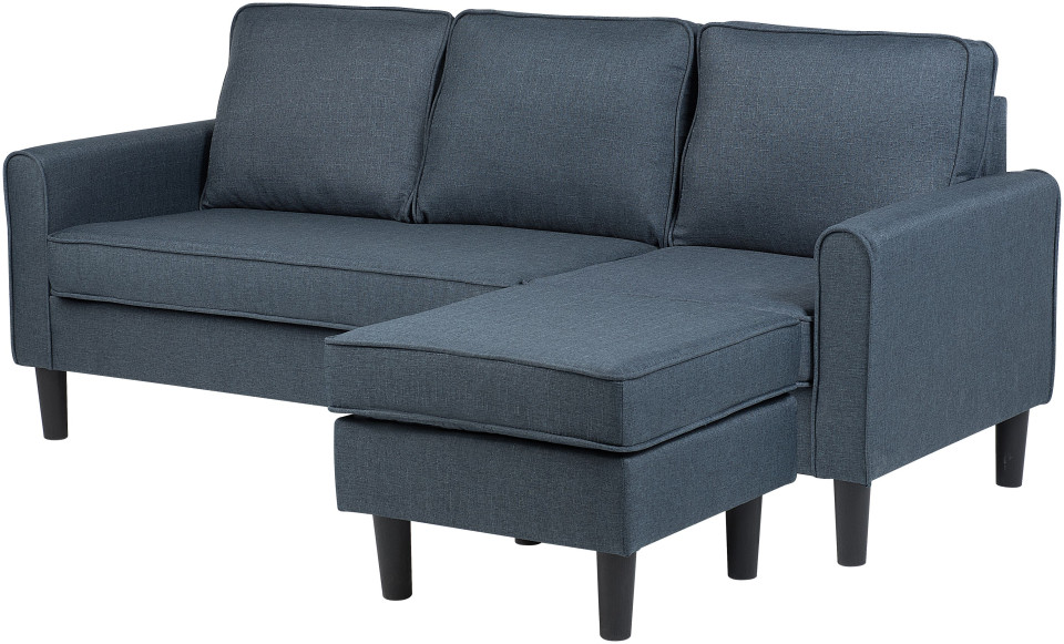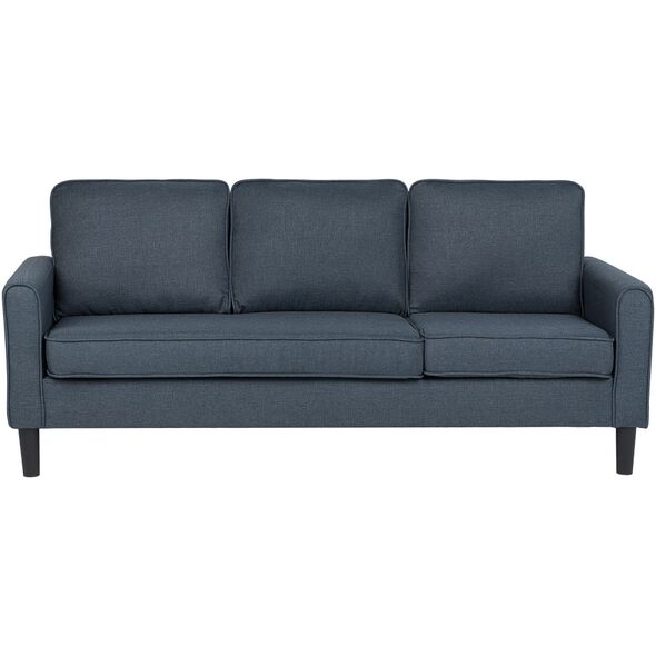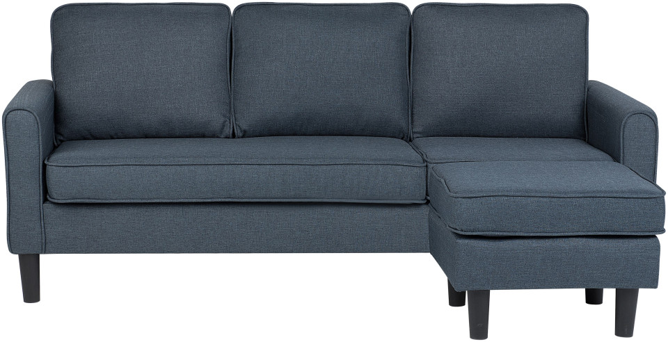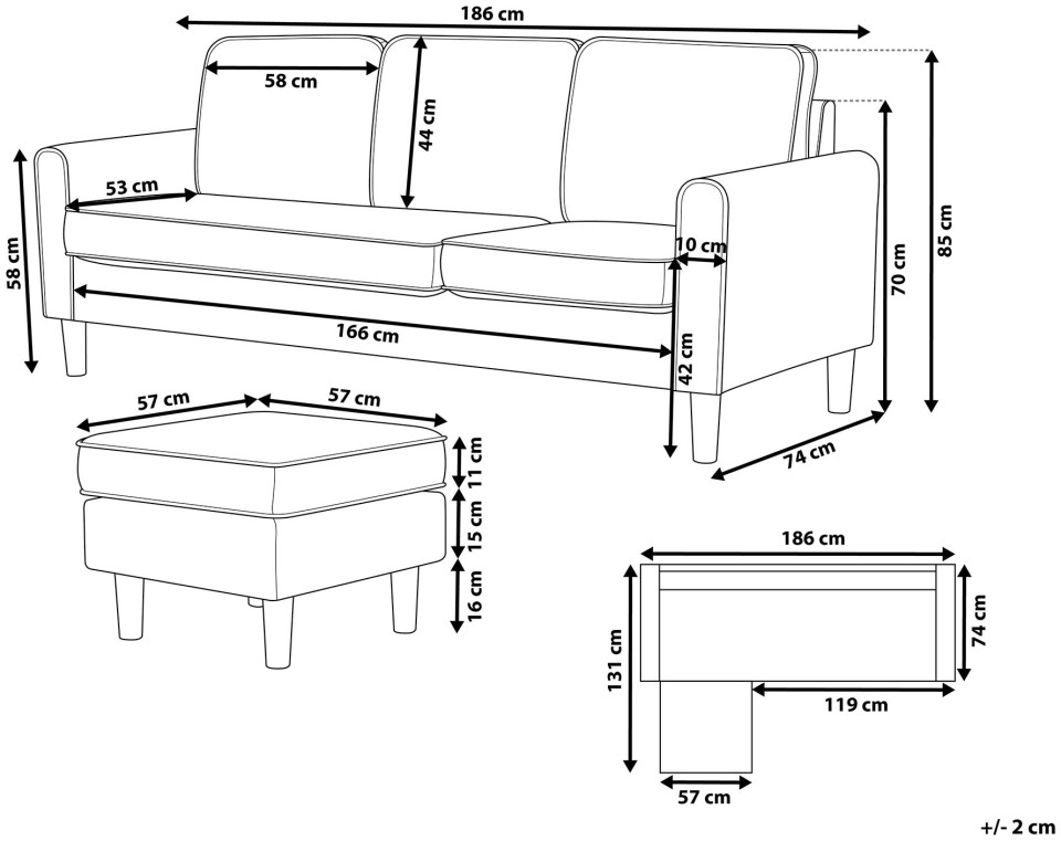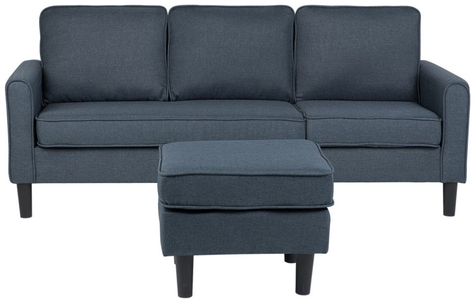 Sofa o tradycyjnym designie. W skład zestawu wchodzi również podnóżek, który zwiększa komfort odpoczynku. Dzięki grubo wyściełanym obiciom i miękkim poduchom na oparciu sofa idealnie sprawdzi się podczas rodzinnych wieczorów, czy spotkań z przyjaciółmi. Dostawiając otomanę po jednej ze stron, szybko stworzysz stylowy narożnik. Prezentowana kanapa to idealnie połączenie funkcjonalności i szyku. Wysokość: 85