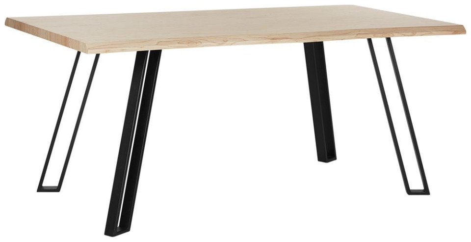 Μια τραπεζαρία με ανοιχτόχρωμη ξύλινη επιφάνεια θα σας βοηθήσει να φωτίσετε την τραπεζαρία σας και να της δώσετε έναν πιο ανάλαφρο χαρακτήρα, χωρίς να διαταράξετε τη συνοχή της διακόσμησης. Η κομψή εμφάνιση παρέχεται από τραπεζοειδές τοπ και μαύρα ματ μεταλλικά πόδια με πρωτότυπο σχήμα. Κατασκευασμένο από σανίδα MDF, εγγυάται υψηλή αντοχή και ανθεκτικότητα του αντικειμένου. Ύψος: 77