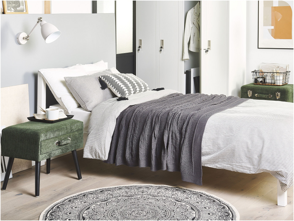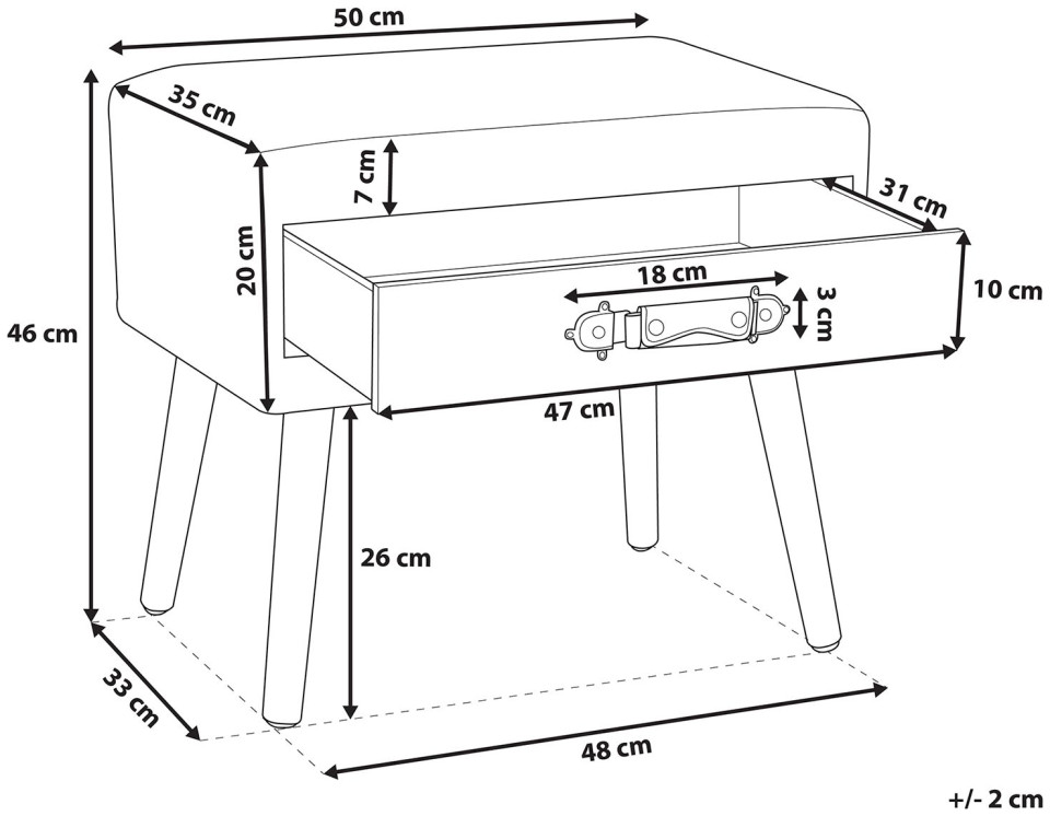 Ένα κομψό κομοδίνο σε vintage στυλ που θα διακοσμήσει κάθε μοντέρνο ή παραδοσιακά επιπλωμένο υπνοδωμάτιο. Επενδυμένο με ανθεκτικό κοτλέ και εξοπλισμένο με λεπτά μαύρα πόδια, θα προσθέσει άνεση στο δωμάτιο. Το φαρδύ συρτάρι προσφέρει άφθονο χώρο για την αποθήκευση φορτιστών, περιοδικών και άλλων μικροαντικειμένων. Ύψος: 46