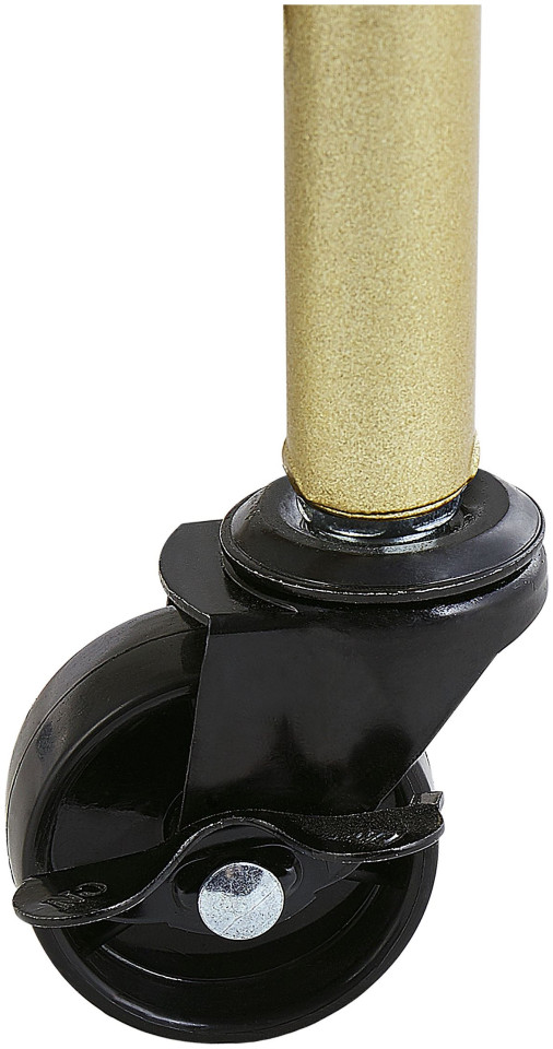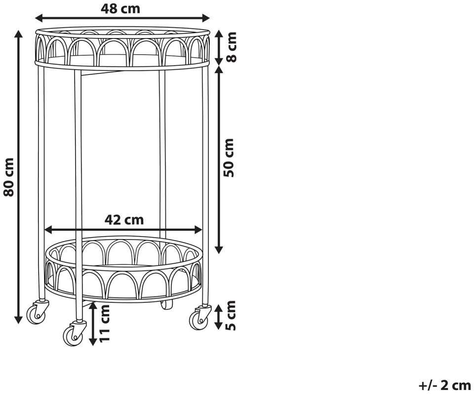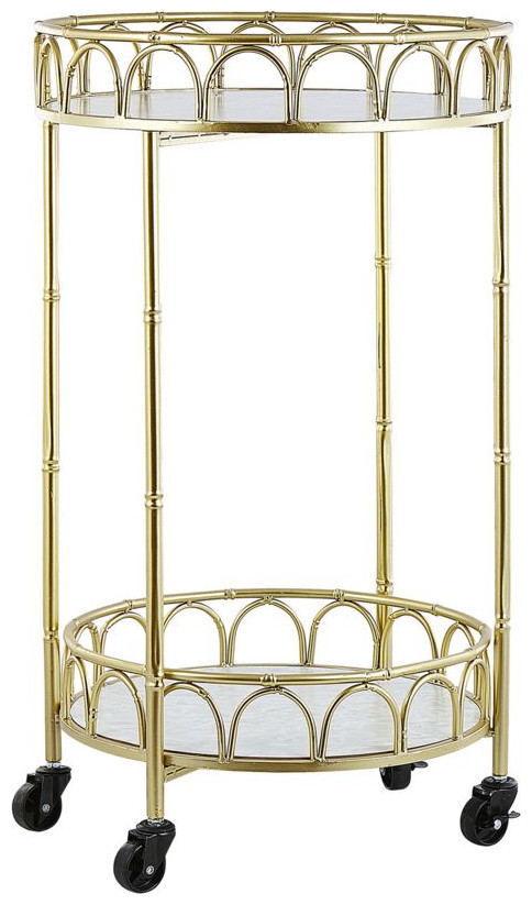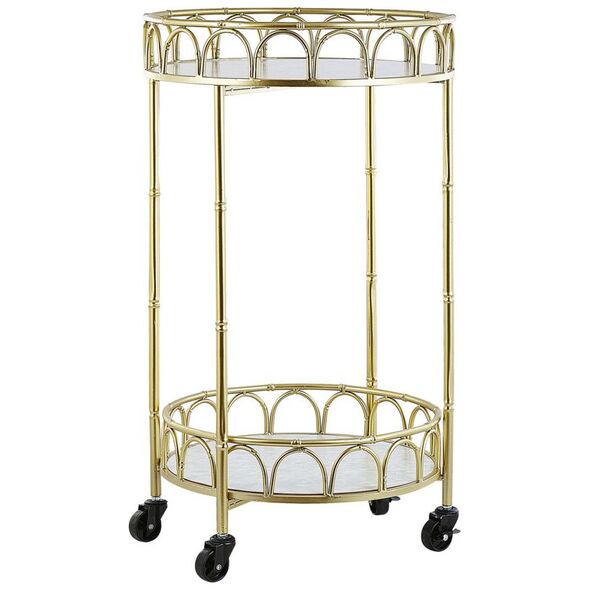 Φέρτε αίγλη στο σπίτι σας με αυτό το βοηθητικό τραπεζάκι με ρόδες, το οποίο μπορεί να χρησιμοποιηθεί και ως καρότσι κουζίνας. Το επάνω ράφι θα σας επιτρέψει να εμφανίσετε βιβλία ή φωτογραφίες με πλαίσιο και στο κάτω ράφι μπορείτε να αποθηκεύσετε ποτήρια ή μπουκάλια. Ο βαμμένος χρυσός σιδερένιος σκελετός σε συνδυασμό με πάγκους με μαρμάρινο αποτέλεσμα το καθιστούν μια εντυπωσιακή προσθήκη στο σαλόνι, αλλά θα λειτουργήσει καλά και σε κάθε κομψή κουζίνα. Χάρη σε αυτό το μοντέρνο καρότσι, ο χώρος σας θα αποκτήσει μια ρετρό εμφάνιση. Ύψος: 80